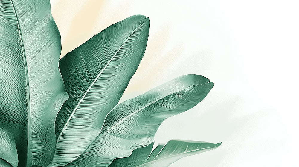 This tropical leaf wallpaper showcases magnificent banana leaves rendered in rich, detailed emerald tones against a soft cream backdrop. Each leaf is masterfully illustrated with intricate vein patterns and natural textures, creating a bold yet sophisticated botanical wall mural. The oversized scale of the foliage makes a dramatic statement while the gentle gradients and organic lines maintain an air of tranquility.