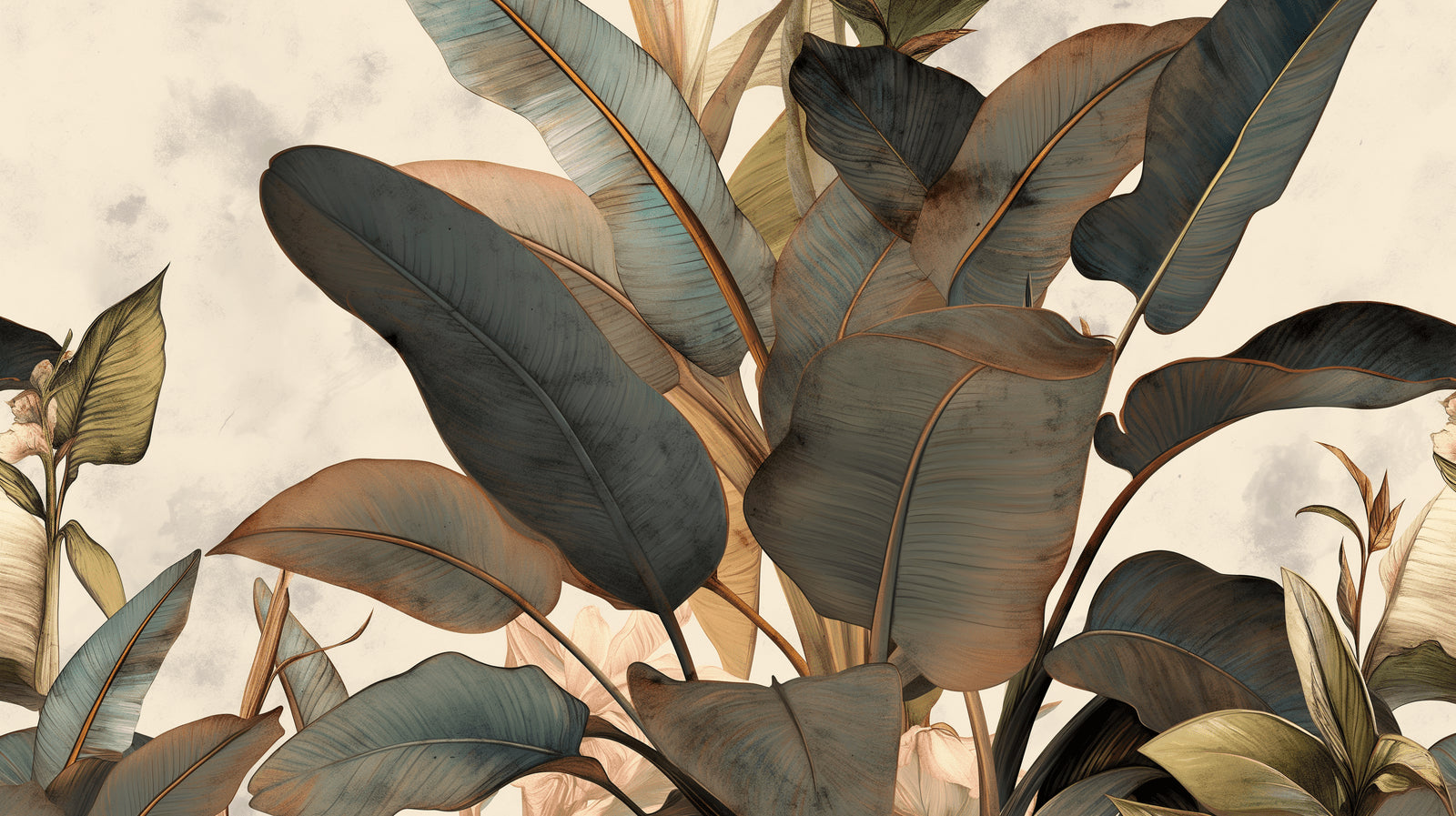 Transform your space with this tropical banana leaf mural that brings an air of refined exotic elegance to any room. The vintage botanical mural creates a statement wall that feels both bold and balanced, perfect for modern interiors seeking to incorporate natural elements with an artistic twist. The large-scale pattern and earthy color palette work together to create a sense of expansiveness while maintaining a sophisticated atmosphere.