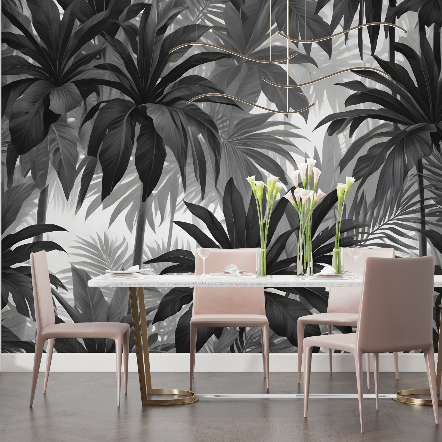 This tropical leaf wallpaper showcases a dramatic display of oversized palm fronds in sophisticated monochrome tones. The bold, botanical pattern features deep charcoal leaves layered against misty gray backgrounds, creating a sense of depth and dimension. Each palm leaf mural element is rendered with exceptional detail, casting subtle shadows that enhance the three-dimensional effect of this black and white tropical wallpaper.