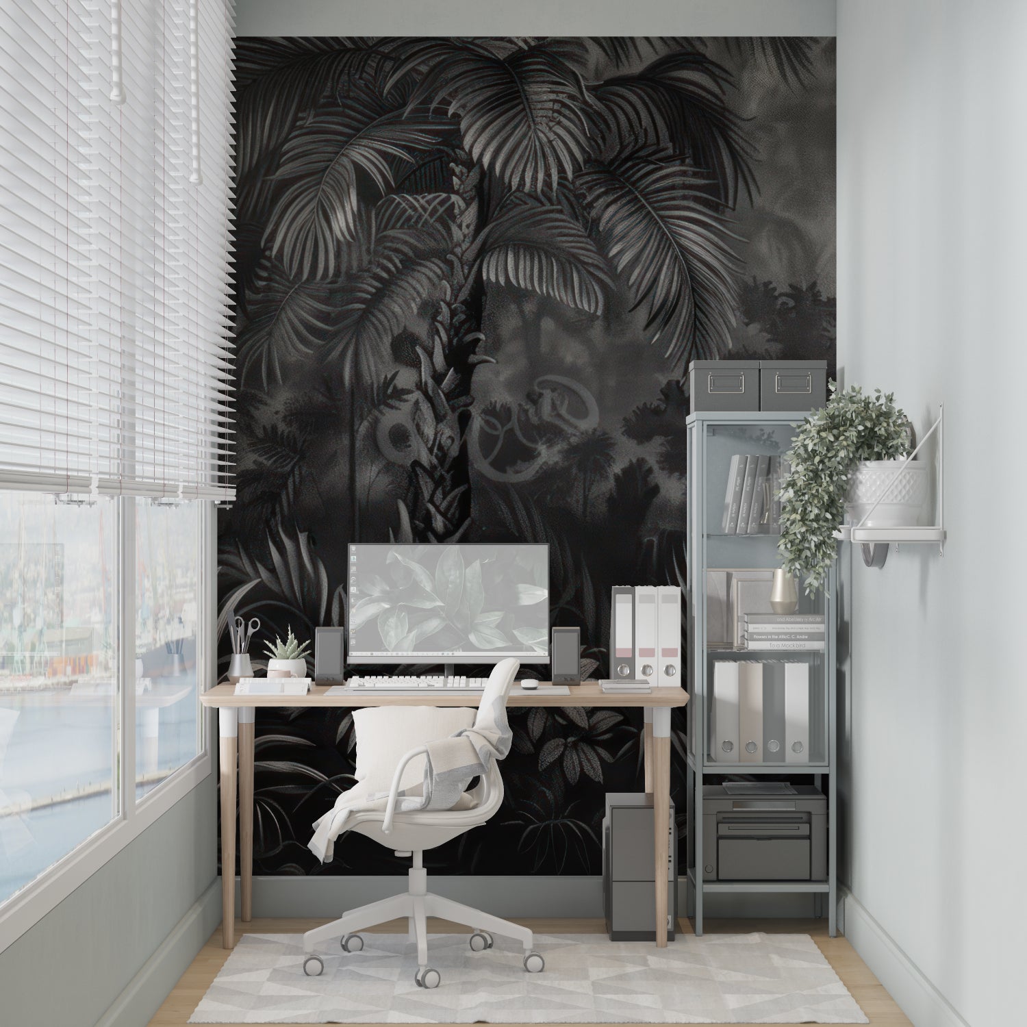 This tropical palm wallpaper creates a sophisticated sanctuary with its dramatic monochrome palette. Intricately detailed palm fronds cascade across a mysterious dark background, while subtle gradients add depth and dimension to the exotic jungle wallpaper. The careful balance of light and shadow brings the lush foliage to life, creating an immersive tropical atmosphere that commands attention without overwhelming the space.