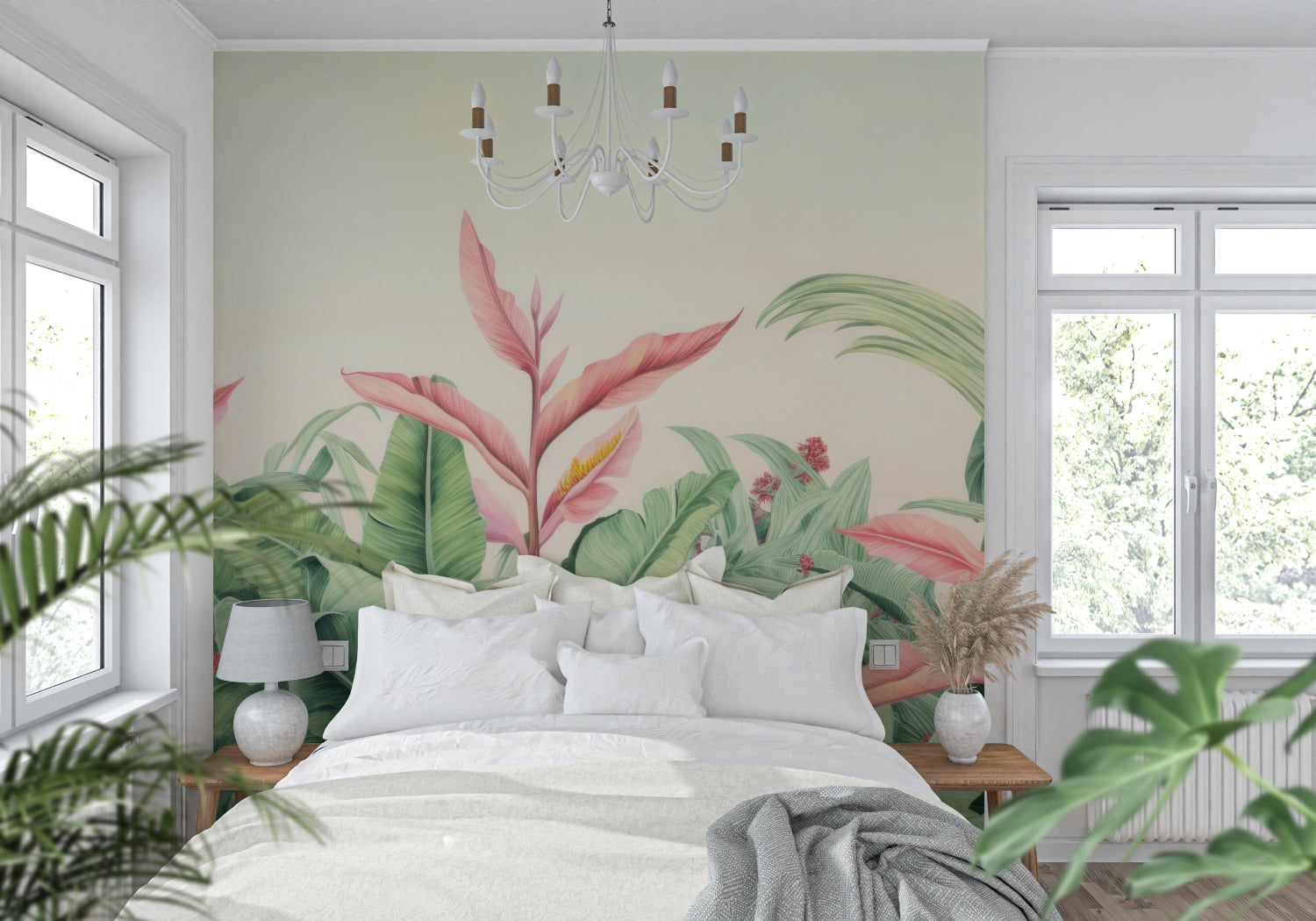 The gentle mix of greens and pinks creates a dreamy botanical wall design that calms your space.