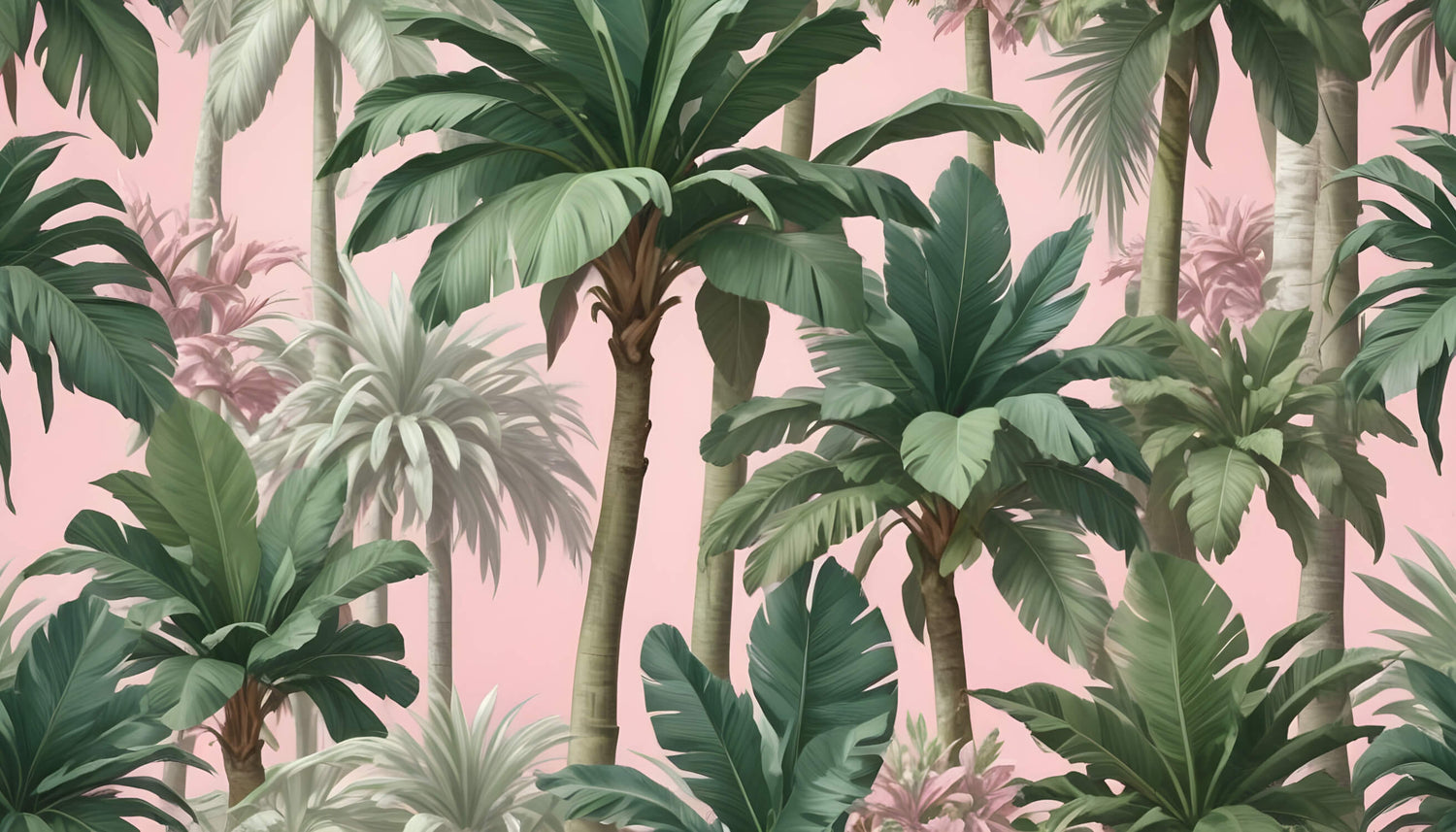 This tropical palm wallpaper creates an enchanting escape with its lush, verdant palm fronds set against a soft pink backdrop. The detailed botanical illustration showcases majestic palm trees with their broad, fan-like leaves in rich emerald tones, creating depth and dimension. The exotic foliage wallpaper brings together the perfect balance of dramatic tropical elements with a gentle, sophisticated color palette.