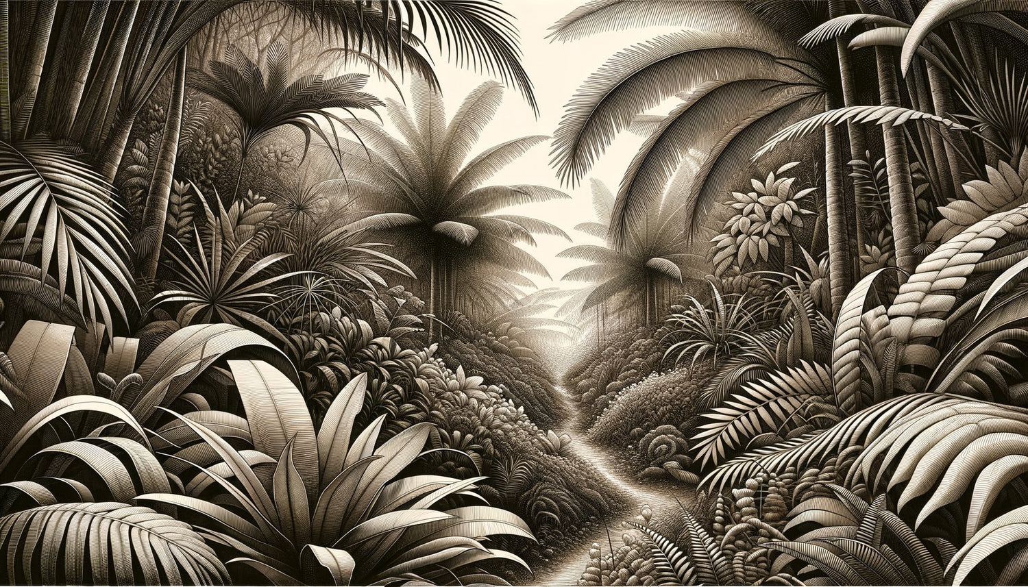 This tropical jungle wallpaper presents an enchanting vista rendered in sophisticated sepia tones, showcasing a masterfully detailed paradise of palm fronds and exotic foliage. The intricate illustration captures towering palm tree wallpaper elements arching gracefully overhead, while dense tropical undergrowth creates layers of depth and dimension. Each leaf and branch is meticulously rendered, creating a rich tapestry of botanical artistry.