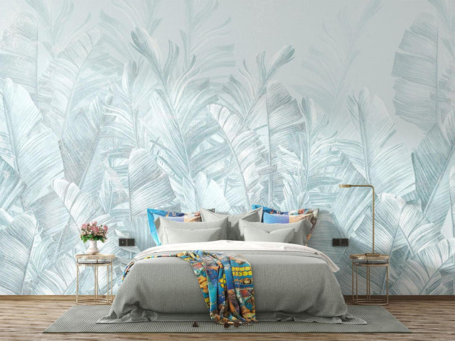 Transform any space into a serene sanctuary with this botanical wall mural. The gentle color palette and tropical leaf wallpaper design work beautifully in both modern and classic interiors, from bedrooms to living spaces. The subtle blue hues and natural motifs create an atmosphere of calm sophistication while adding architectural interest and depth to your walls.