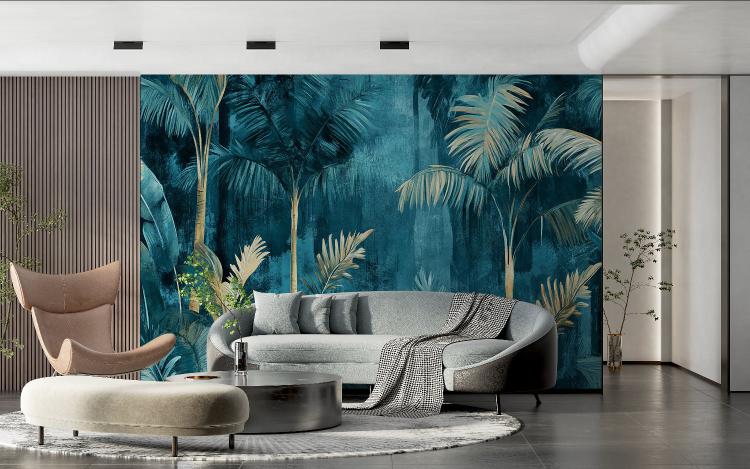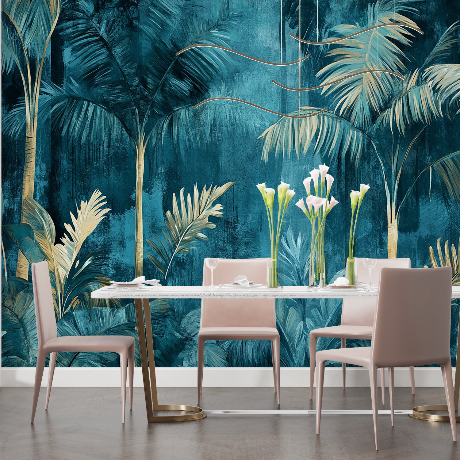 Transform your space with this luxury tropical wallpaper that brings the serenity of an exotic oasis into your home. The palm leaf mural creates a dramatic yet soothing atmosphere, perfect for spaces where you seek to combine bold design with natural elements. The interplay of deep teals and metallic accents ensures this wallpaper adds both warmth and sophistication to any interior setting.