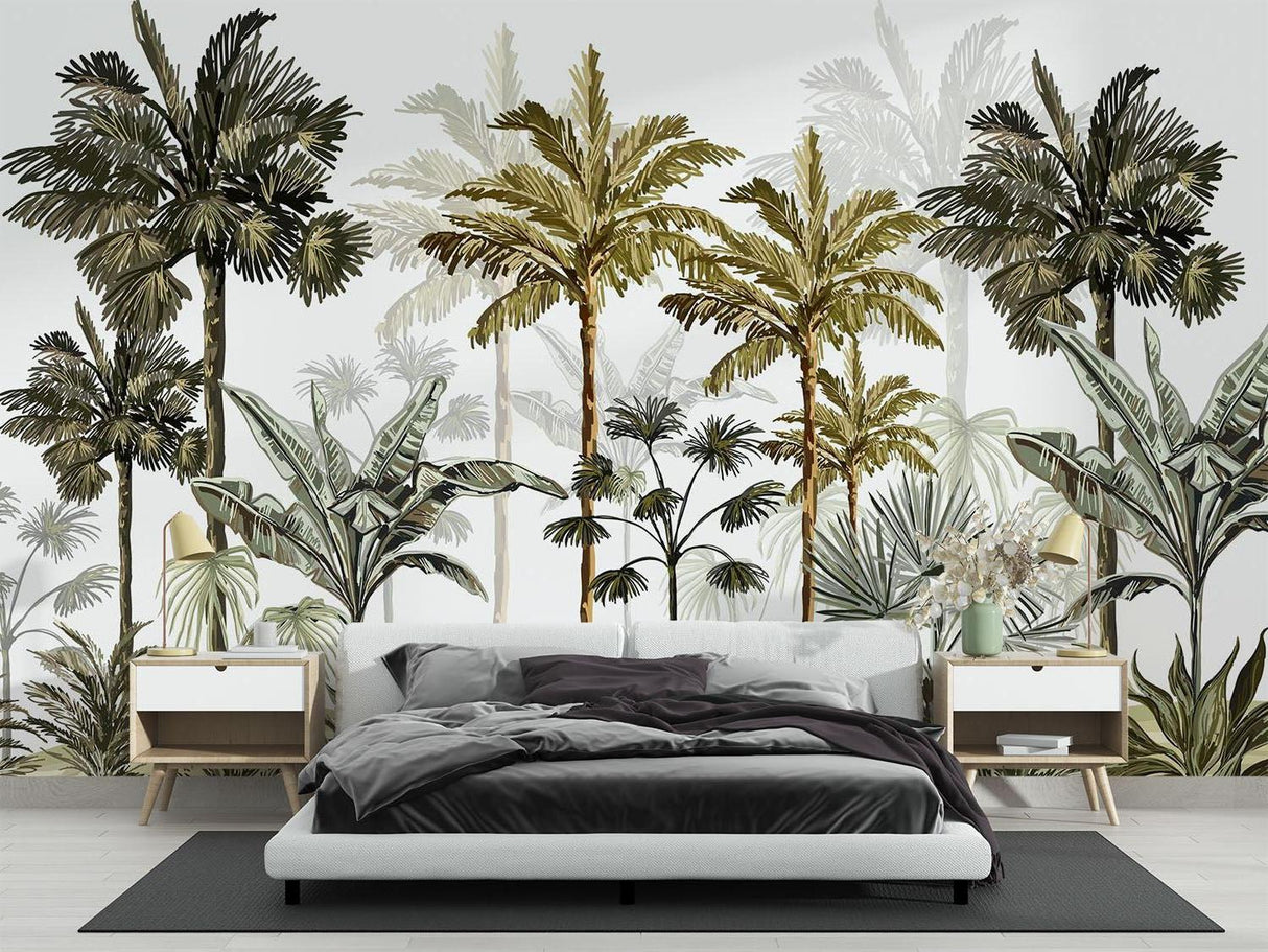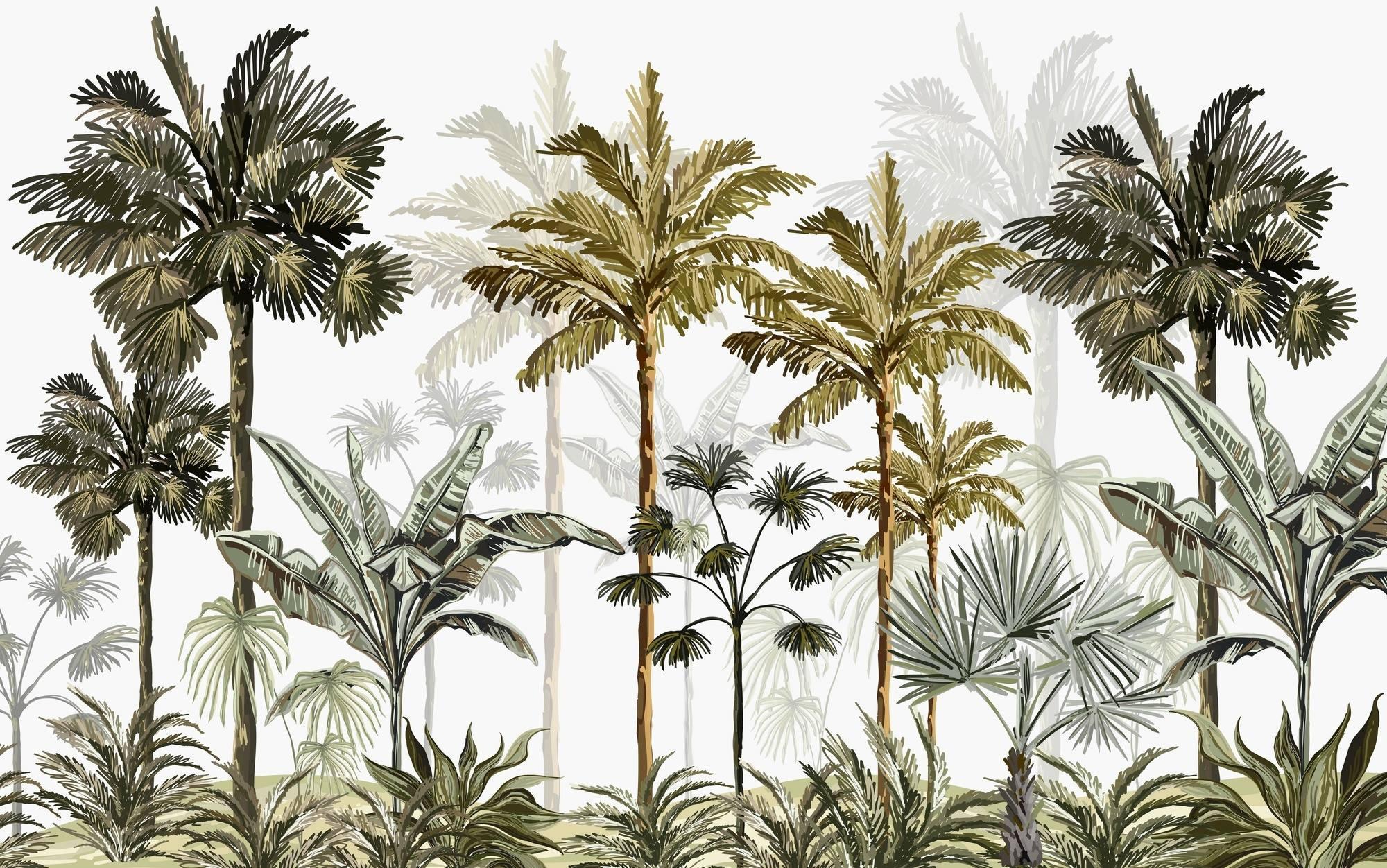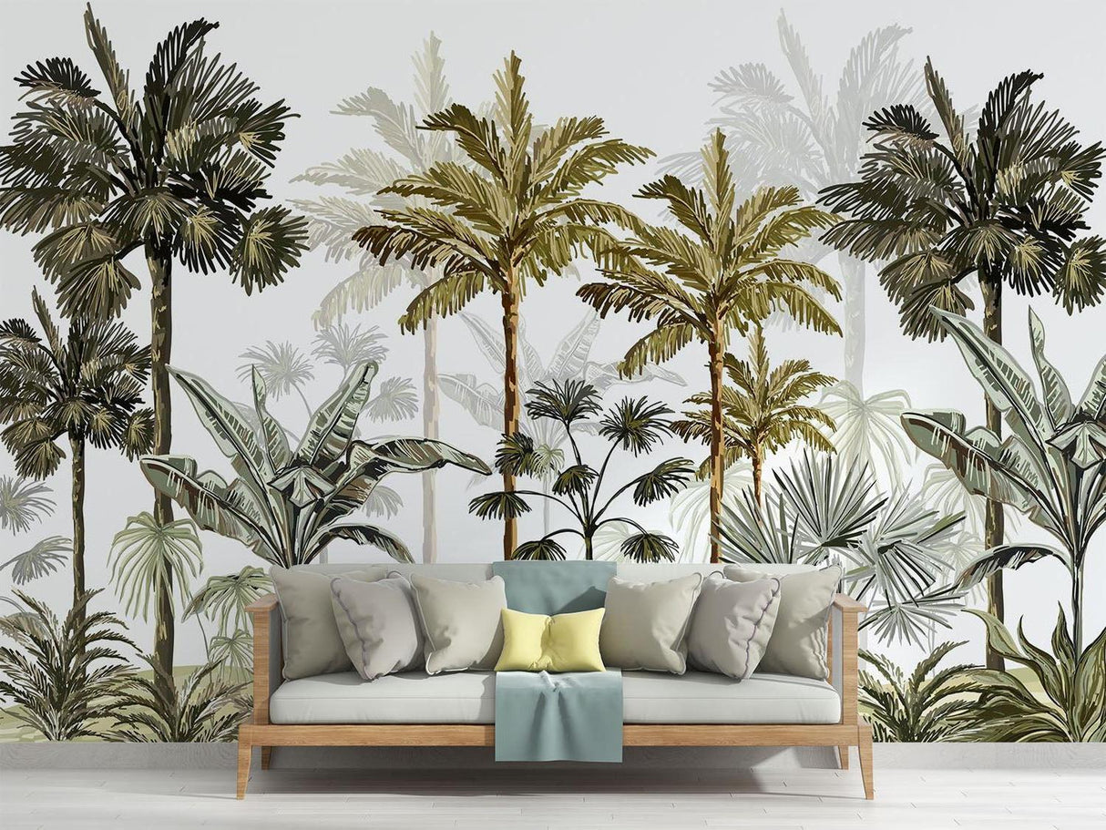 Transform any space into an elegant retreat with this palm tree mural wallpaper. The natural palette of olive greens and warm browns pairs beautifully with both neutral and bold furnishings, making it versatile for various interior styles. This tropical wall mural brings a sense of serenity and exotic charm while maintaining a refined, sophisticated atmosphere that works equally well in contemporary or traditional settings.