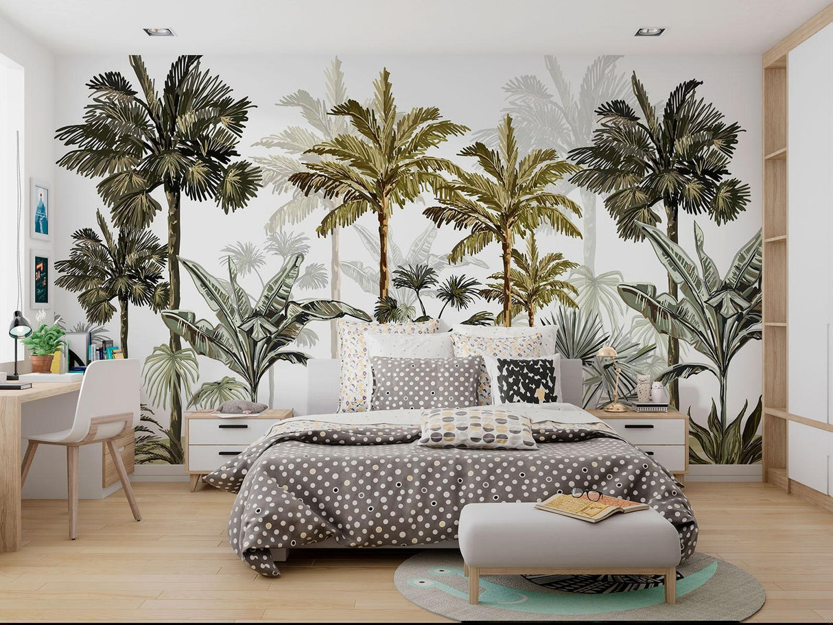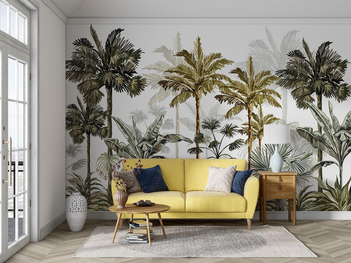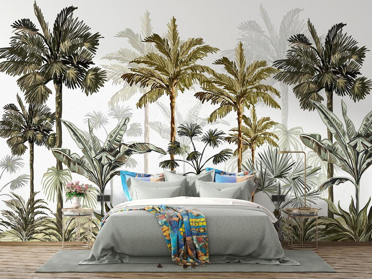 Transform any space into an elegant retreat with this palm tree mural wallpaper. The natural palette of olive greens and warm browns pairs beautifully with both neutral and bold furnishings, making it versatile for various interior styles. This tropical wall mural brings a sense of serenity and exotic charm while maintaining a refined, sophisticated atmosphere that works equally well in contemporary or traditional settings.