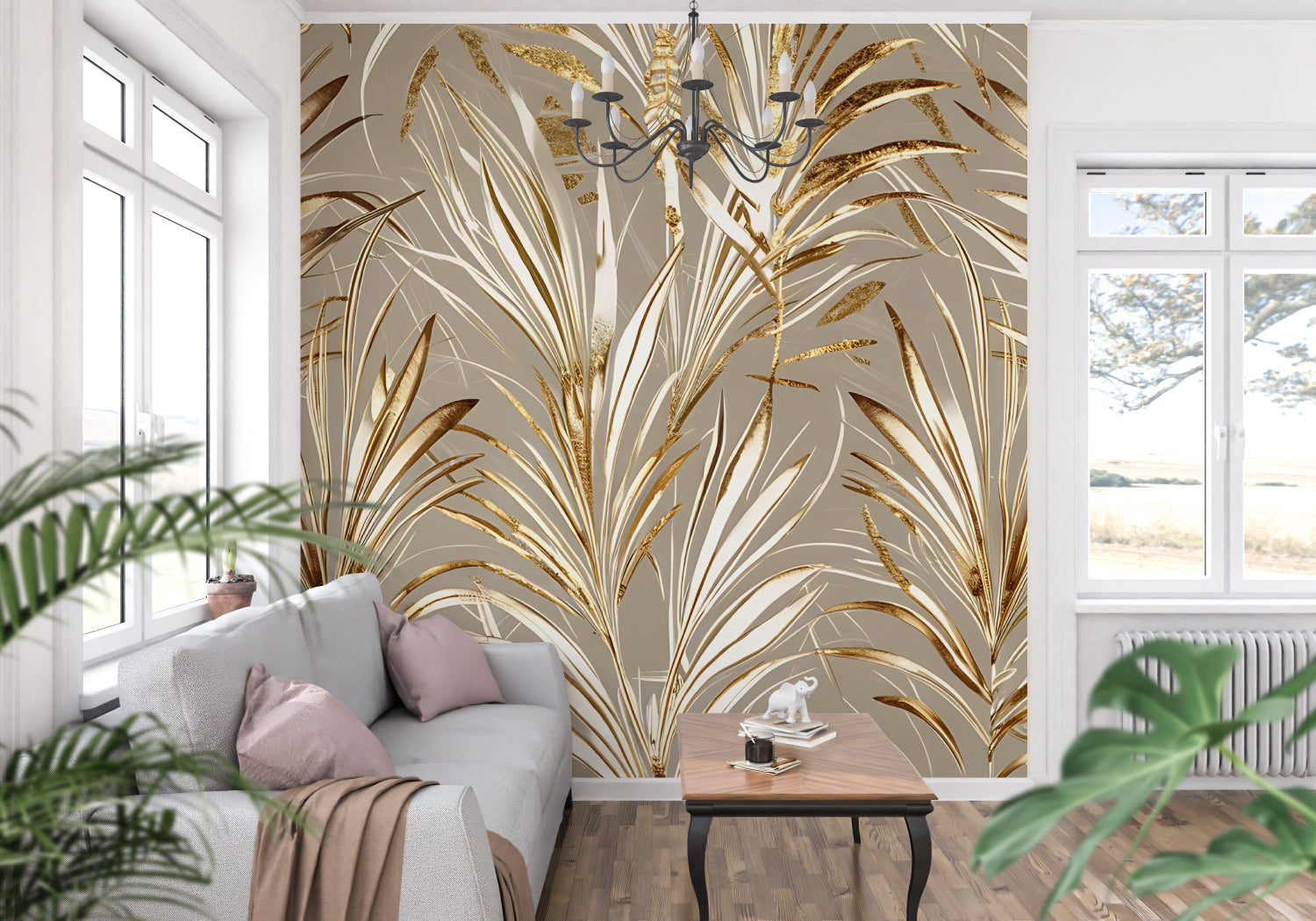 Transform your space with this gold leaf wall mural that brings refined luxury to any interior. The modern botanical wallpaper creates an atmosphere of understated opulence, perfect for those seeking to combine natural elements with metallic refinement. Its versatile design harmonizes beautifully with both modern and classic furnishings, making it an ideal choice for creating an sophisticated ambiance.