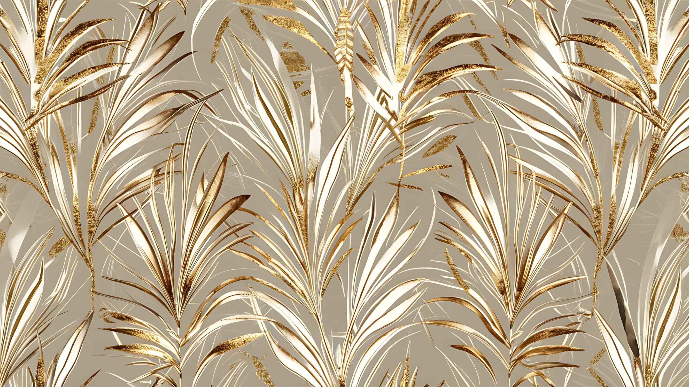 This luxury palm leaf wallpaper showcases an elegant arrangement of cream-white palm fronds adorned with shimmering gold accents against a soft grey backdrop. The graceful curves of the tropical leaf wallpaper create a sophisticated rhythm, while metallic gold details catch and reflect light, adding depth and dimension to the contemporary botanical design.