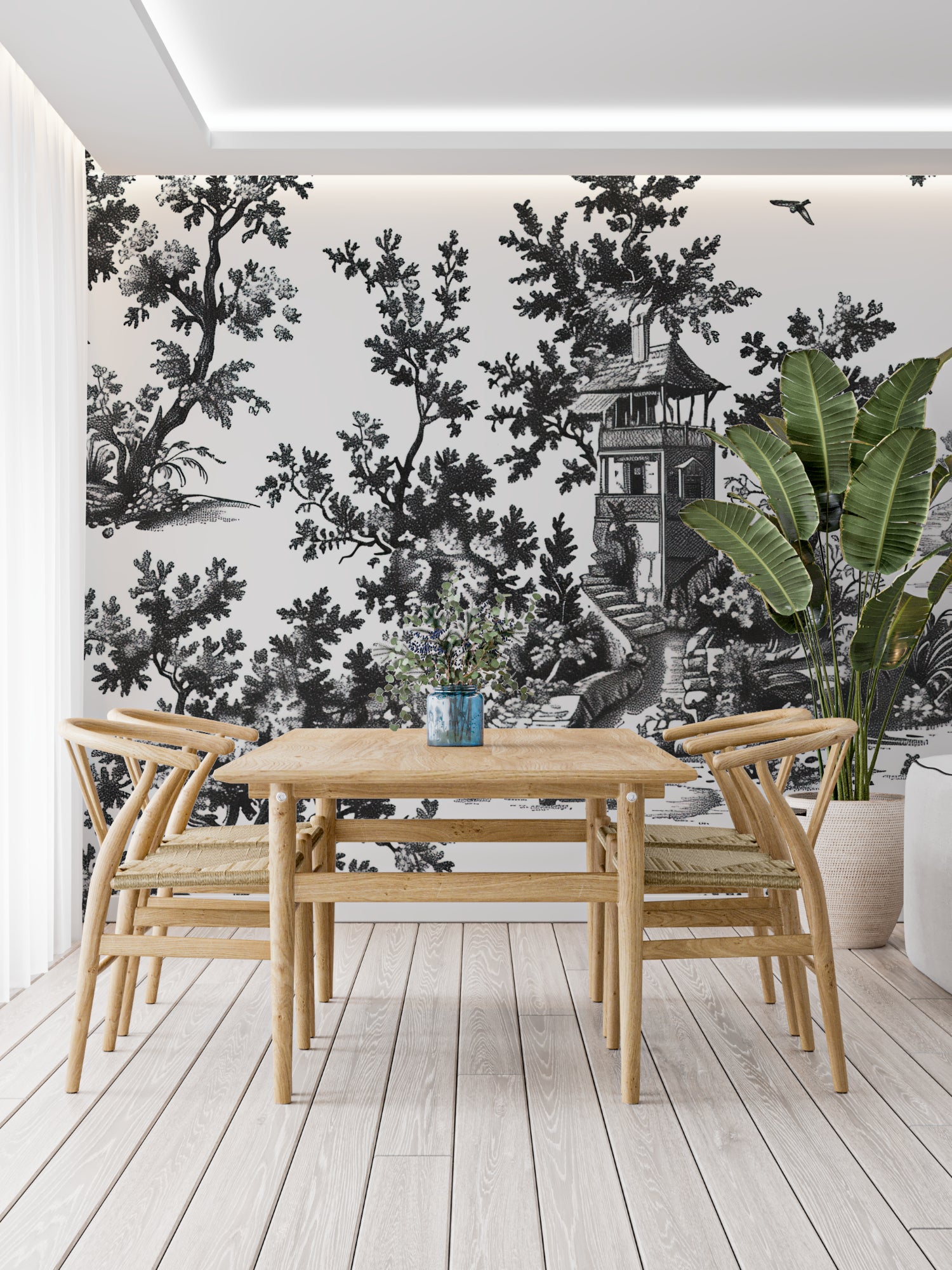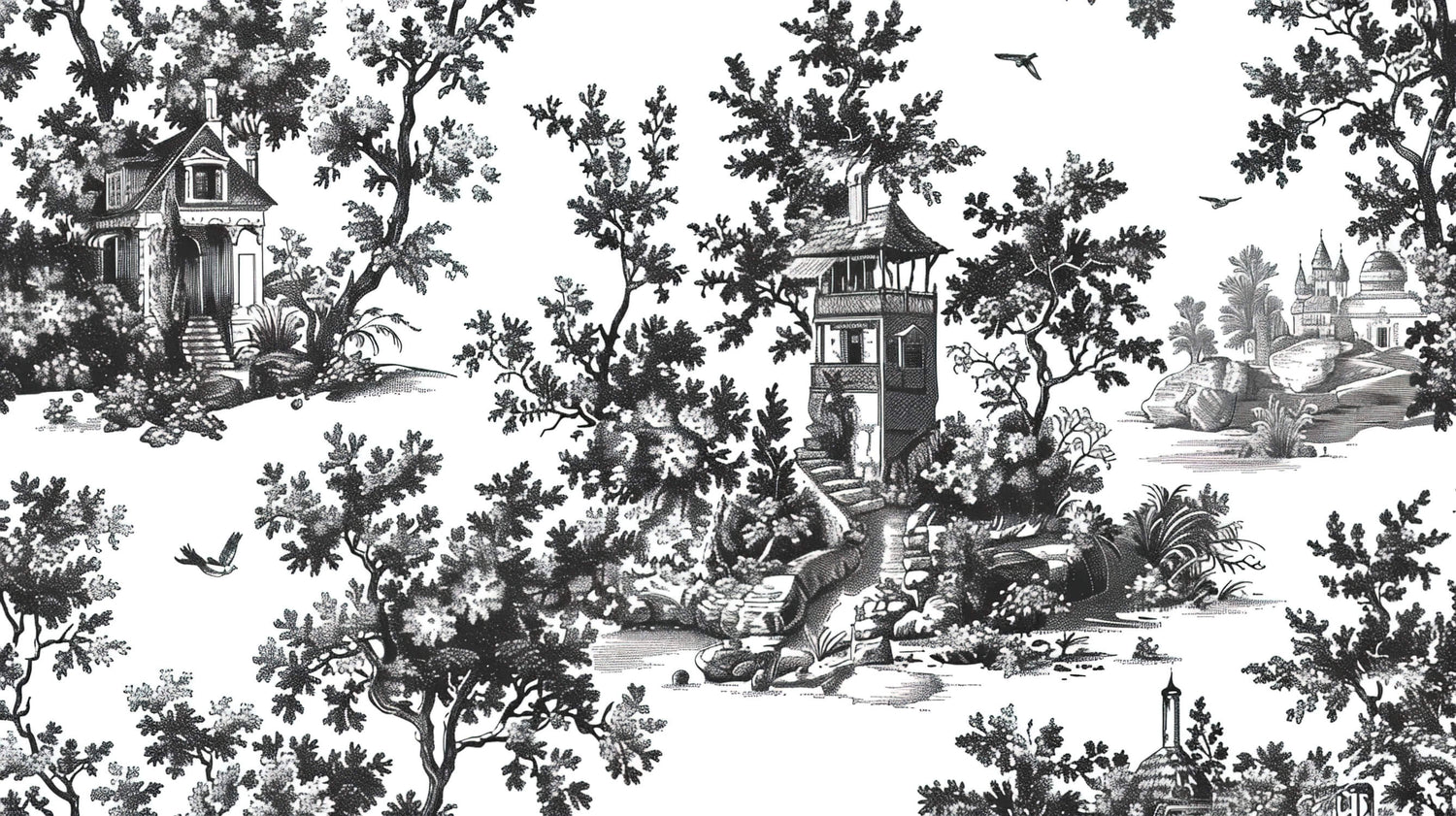 This vintage toile de jouy wallpaper presents an enchanting monochromatic landscape where classical architecture meets nature in perfect harmony. The intricate black-and-white design features detailed illustrations of elegant buildings, watchful towers, and graceful trees creating a sophisticated pastoral scene. Each element is masterfully rendered in the traditional toile de jouy style wallpaper, showcasing delicate linework and precise shading that brings depth to the composition.