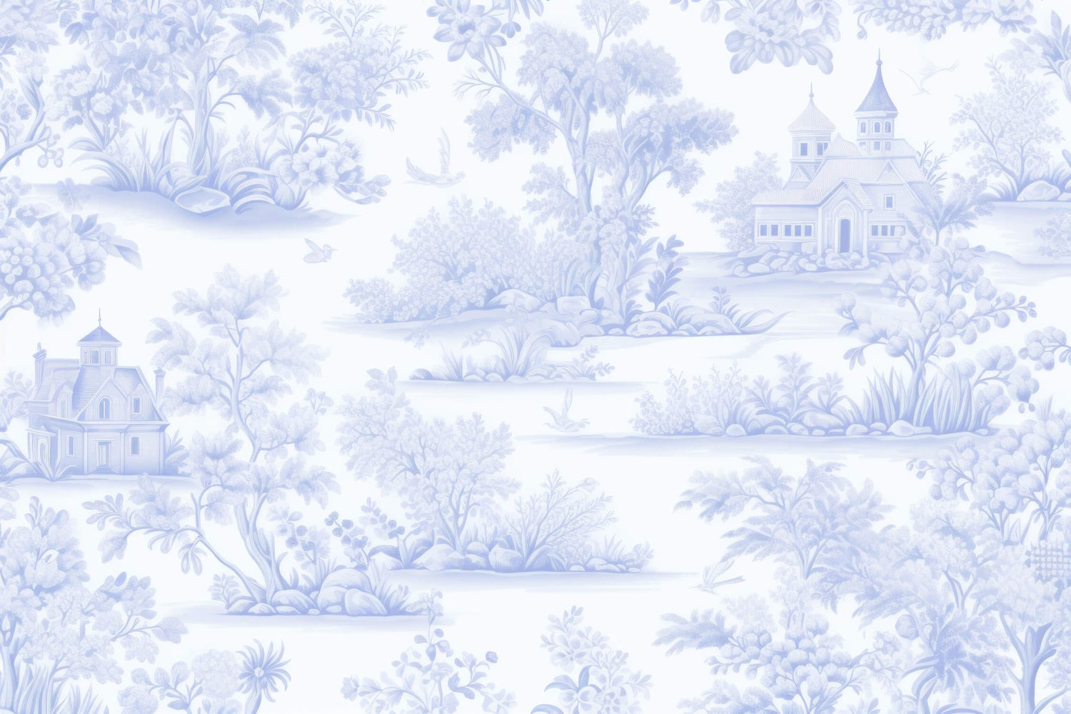 This French toile wallpaper captures the essence of classical elegance with its delicate pastoral scenes rendered in soft-blue hues against a pristine white background. Featuring meticulously detailed architectural elements, including charming churches and traditional buildings, this vintage toile mural interweaves graceful foliage, gentle landscapes, and sophisticated botanical motifs in a harmonious composition that speaks of timeless refinement.