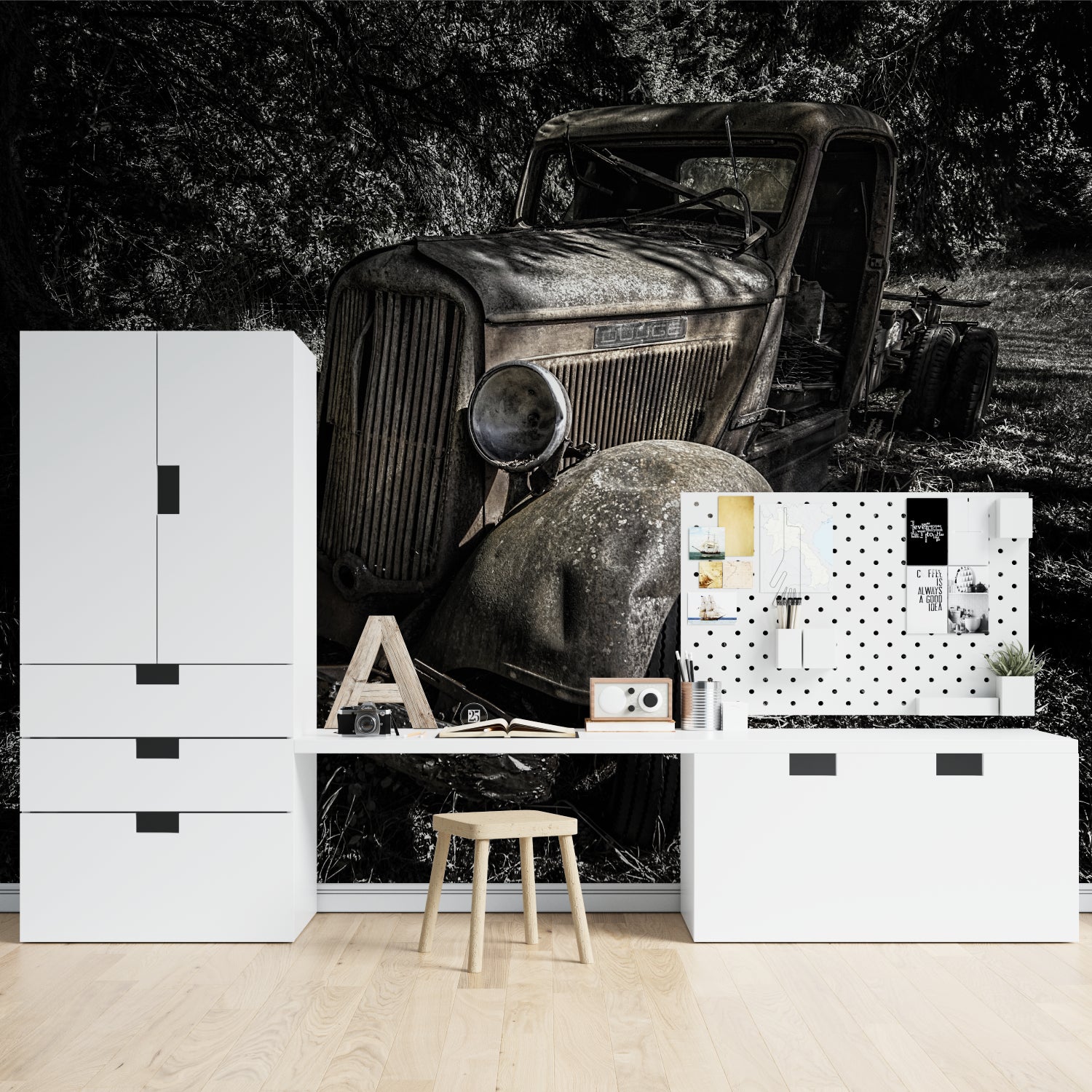This vintage automobile wallpaper showcases a striking monochromatic composition featuring a classic truck captured in timeless black and white. The weathered vehicle stands as a testament to industrial heritage, with its detailed grille work and aged patina creating a compelling focal point. The dramatic contrast between light and shadow emphasizes the retro car mural design, while the surrounding natural elements add depth and context to this atmospheric scene.