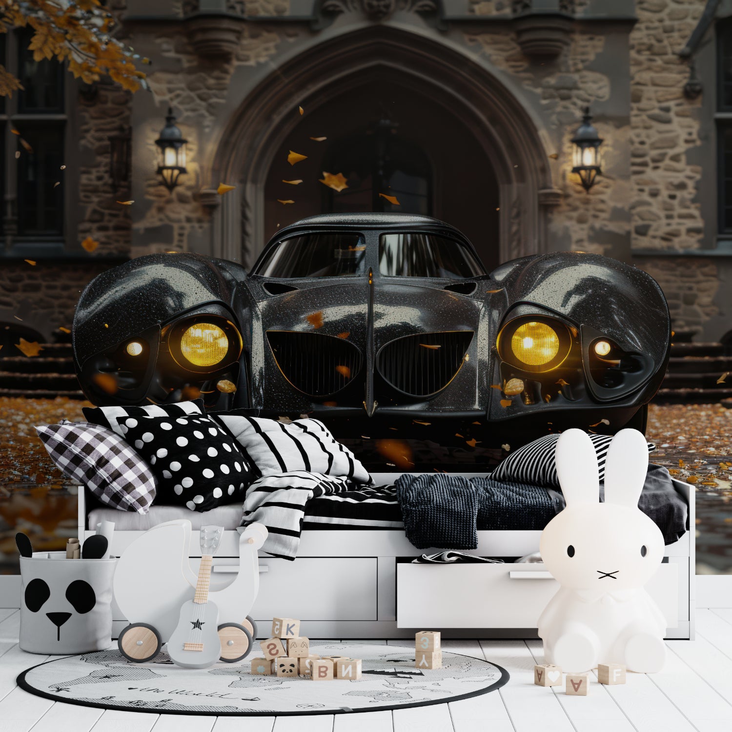The black and white car mural creates depth that transforms ordinary rooms into galleries.