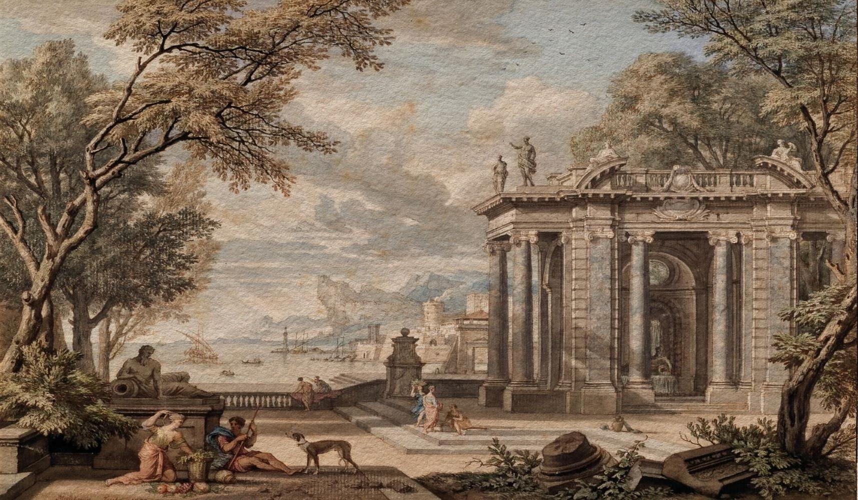 This vintage landscape wallpaper showcases a magnificent Italian architectural scene rendered in delicate sepia tones. The classical pavilion with its elegant columns and sculptural details stands as the focal point, while autumn-hued trees frame the composition. The classical architecture wallpaper extends into a dreamy coastal landscape, where distant mountains and sailing vessels create layers of atmospheric depth.