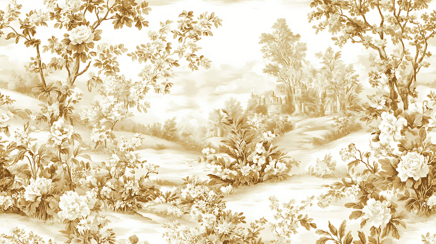 This enchanting vintage floral wallpaper showcases a masterful interpretation of classic Toile de Jouy artistry. The delicate golden-beige hues paint an ethereal landscape where blooming flowers and graceful foliage intertwine with distant architectural elements. Each brushstroke in this pastoral scene wallpaper creates a sophisticated narrative, with soft-flowing lines and meticulous details that capture the essence of timeless French design.