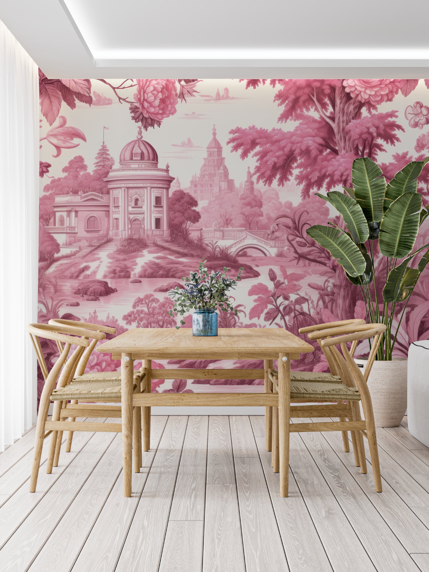 Vintage Mural Wallpaper | Pink Toile de Jouy Palace Scene