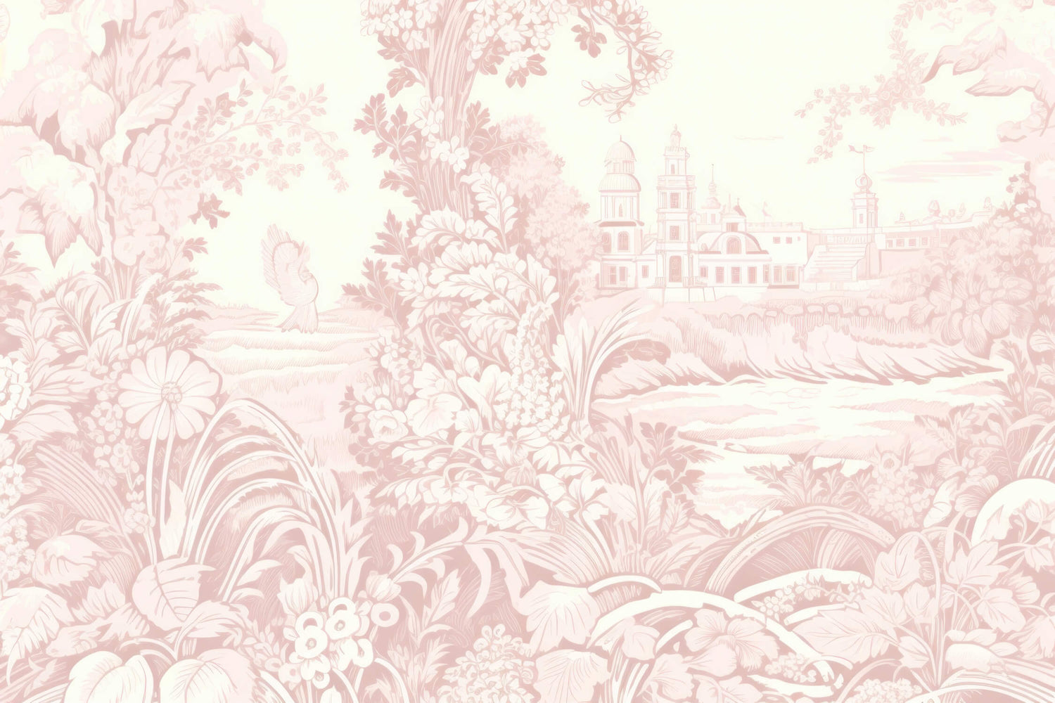 This elegant floral toile wallpaper showcases a masterful blend of pastoral scenery and architectural beauty rendered in soft, dusty-pink tones against a cream background. The delicate composition features graceful foliage, blooming flowers, and a charming distant castle, all illustrated in the classic French toile pattern style that speaks of timeless sophistication and artistic heritage.