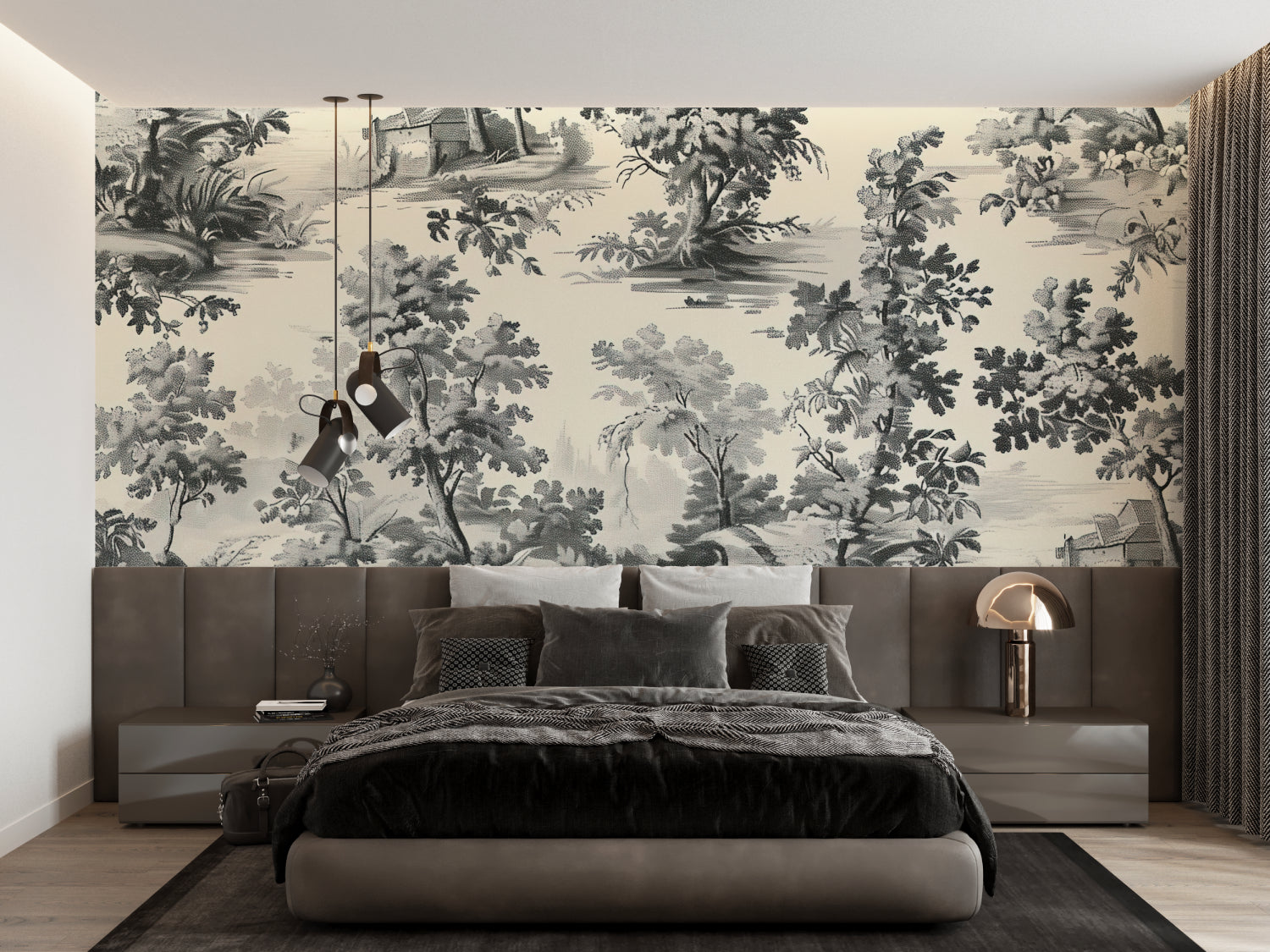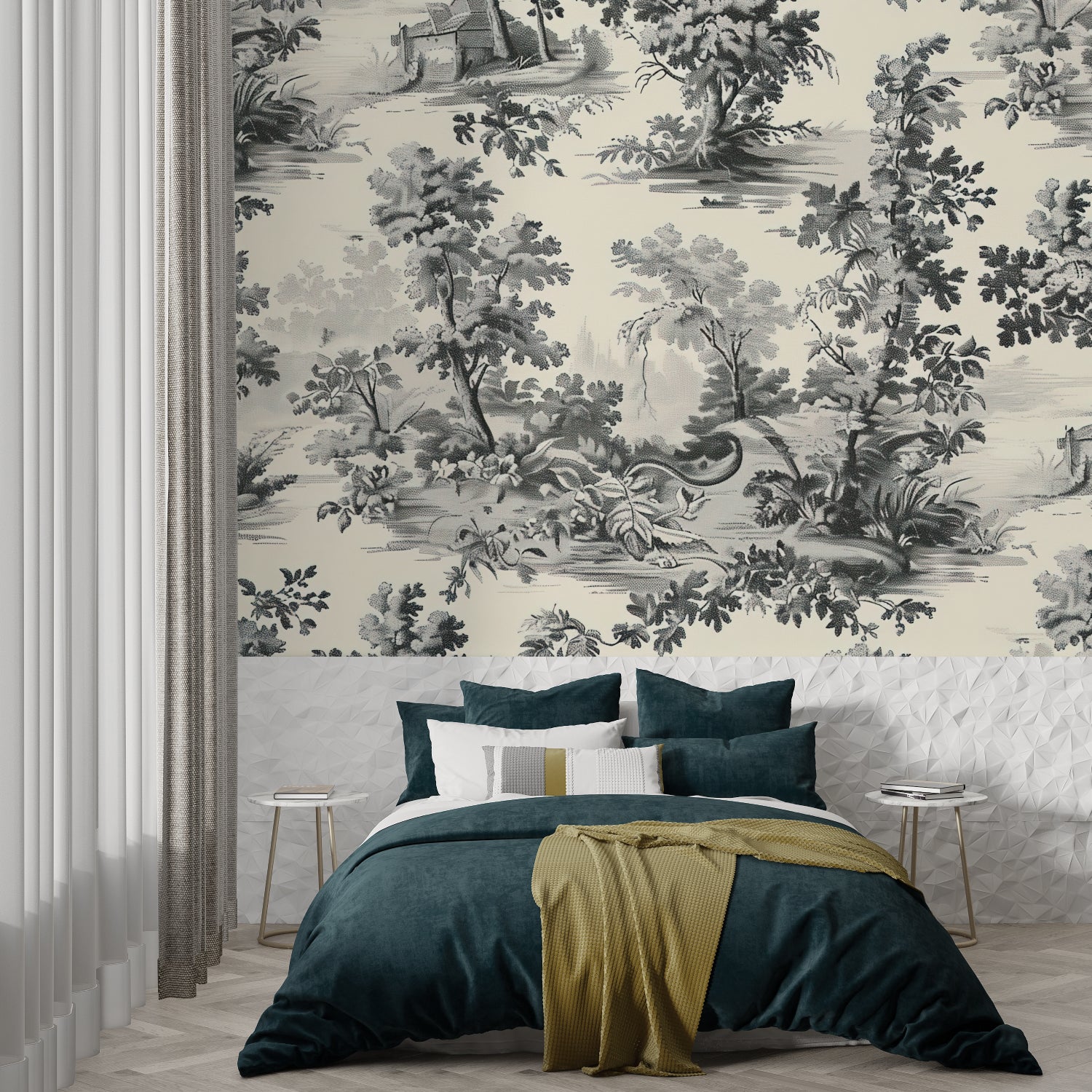 This classic toile de jouy wallpaper captures the timeless elegance of traditional French design with its sophisticated grey-scale botanical rendition. Set against a warm cream background, the intricate scenes feature delicately rendered trees, foliage, and architectural elements that create a captivating pastoral narrative. Each carefully crafted detail in this vintage botanical wallpaper brings forth a sense of historical charm and artistic refinement.