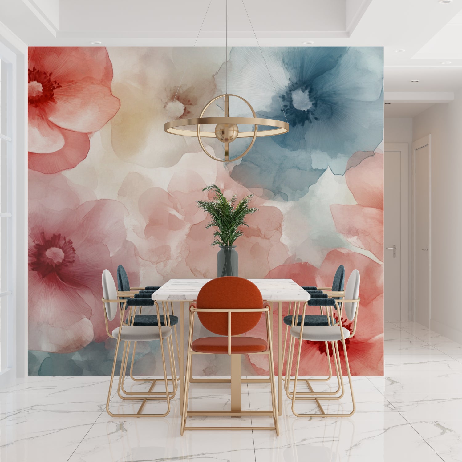 This watercolor floral wallpaper presents an enchanting blend of delicate blooms rendered in dreamy watercolor techniques. Soft coral-pink petals float gracefully against misty blue accents, creating a sophisticated dance of color and form. The abstract floral wallpaper features expertly crafted transitions between hues, with each flower seemingly dissolving into gentle washes of color that create depth and movement across the wall.