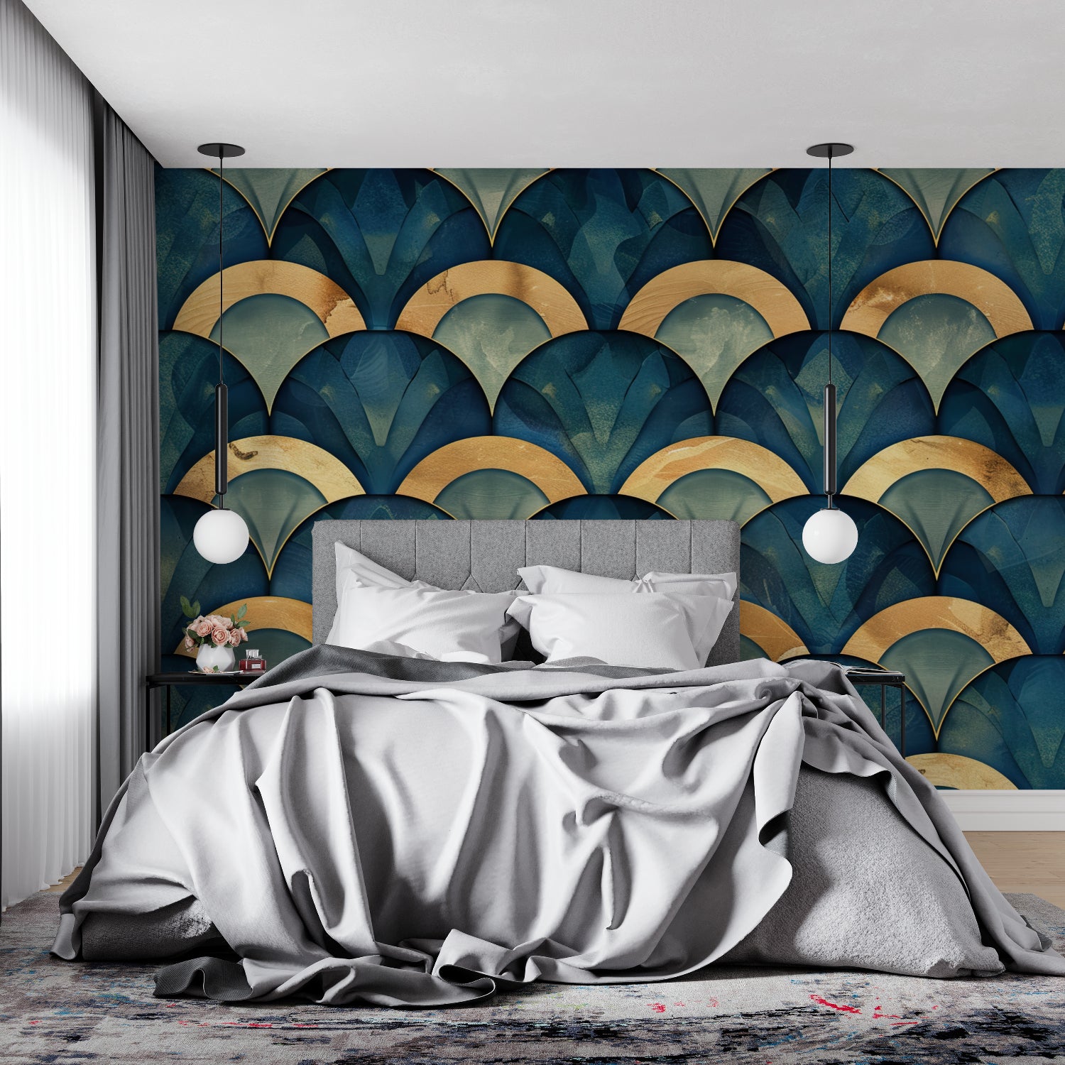 Art Deco Tapet | Blå och Guld Fläktmönster