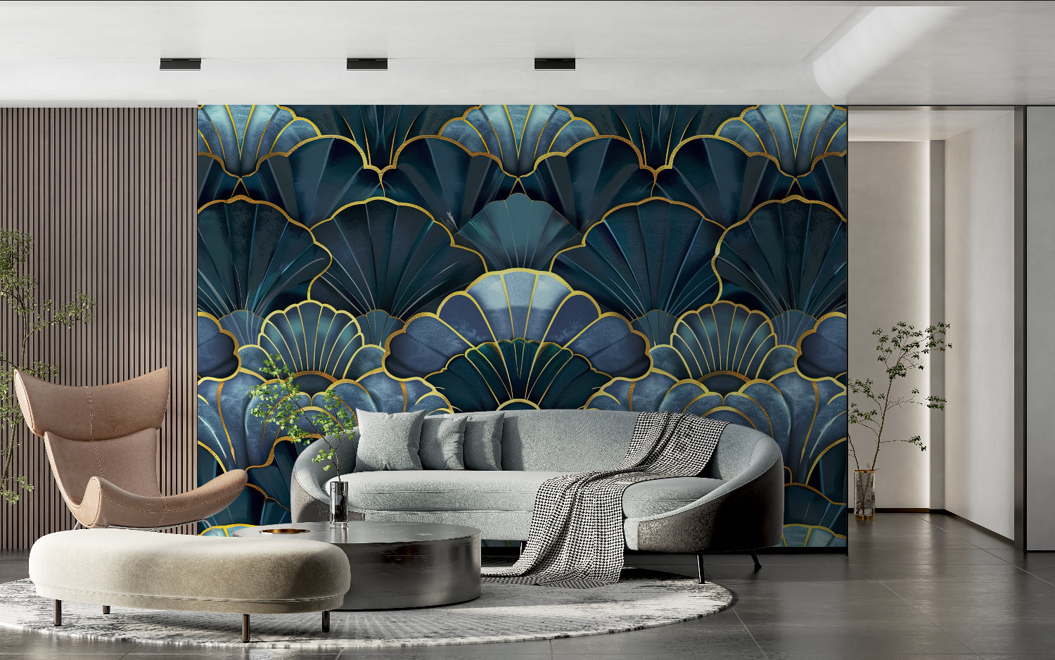 Art Deco Tapet | Blå och Guld Fläktmönster