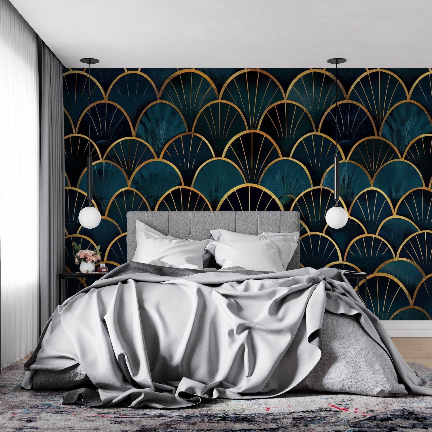 Art Deco Tapet | Geometriskt Fläktmönster i Teal och Guld