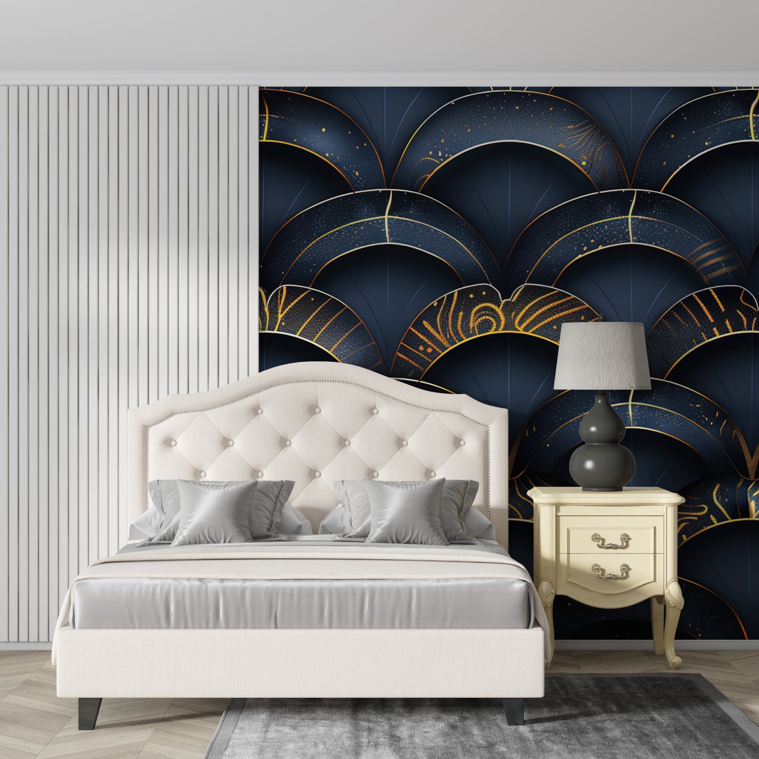 Förvandla ditt utrymme med denna marinblå och gyllene tapet som tillför teatralisk dramatik och förfinad elegans till vilket rum som helst. Art deco-muralen skapar en atmosfär av sofistikerad lyx, vilket gör den till ett idealiskt val för utrymmen där du vill göra ett djärvt designuttryck samtidigt som du behåller en tidlös sofistikering. Den harmoniska blandningen av djupblått och metalliska gyllene accenter tillför djup och karaktär som höjer hela rummets stämning.