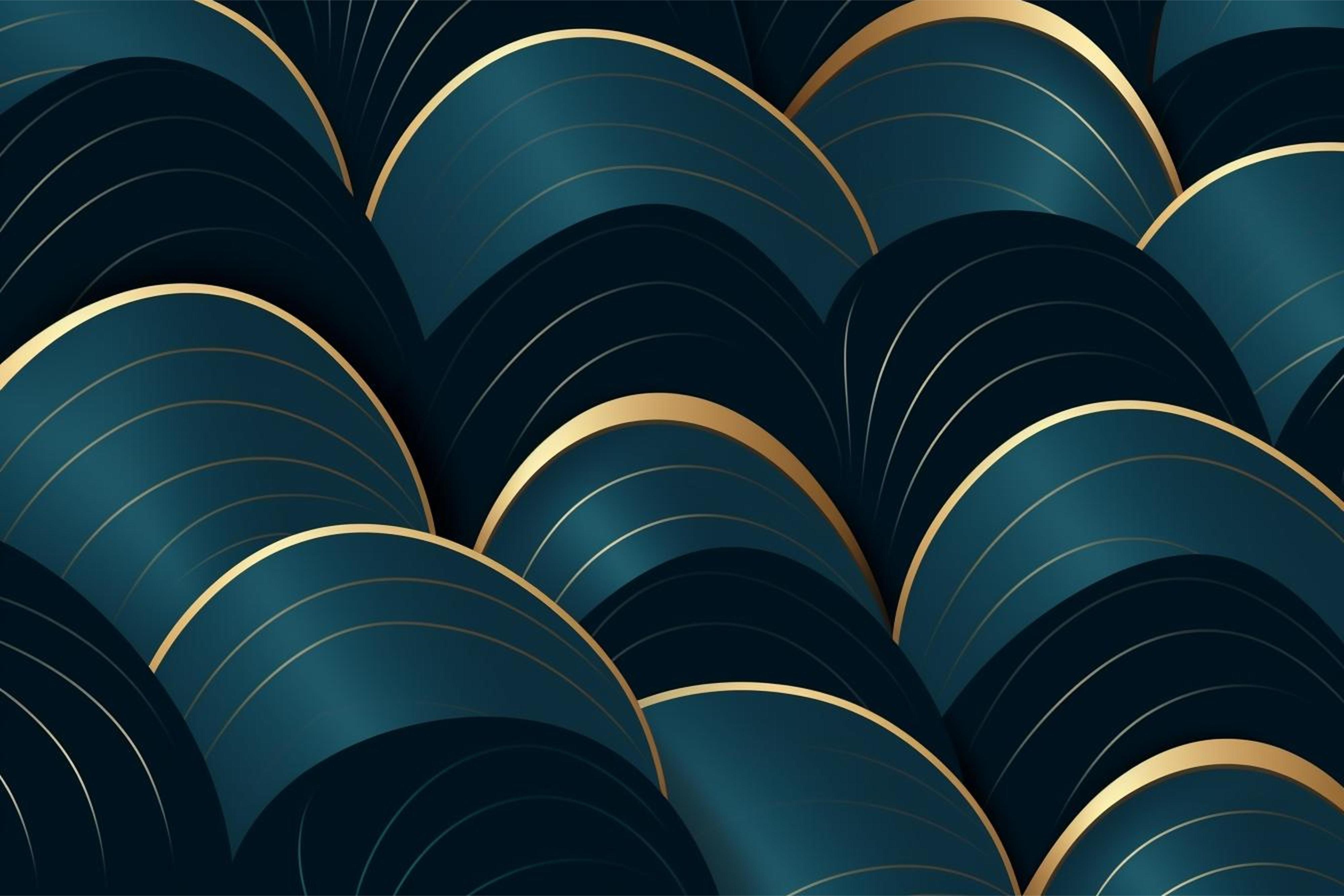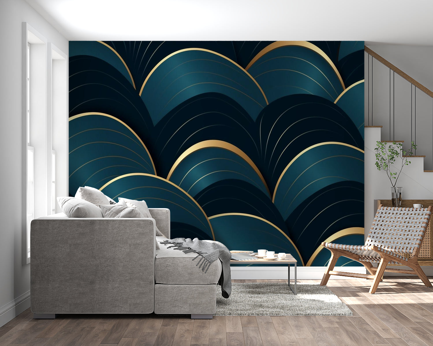 Denna art deco tapet visar ett fascinerande mönster av överlappande bågar i rik teal-blå, accentuerad med glänsande guldlina. Den sofistikerade designen skapar en känsla av djup och rörelse, där varje böjt element flyter sömlöst in i nästa. Den geometriska tapeten kombinerar modern lyx med klassisk art deco-känsla, där exakt guldkant framhäver de rytmiska vågliknande motiven mot den djupa, mättade bakgrunden.