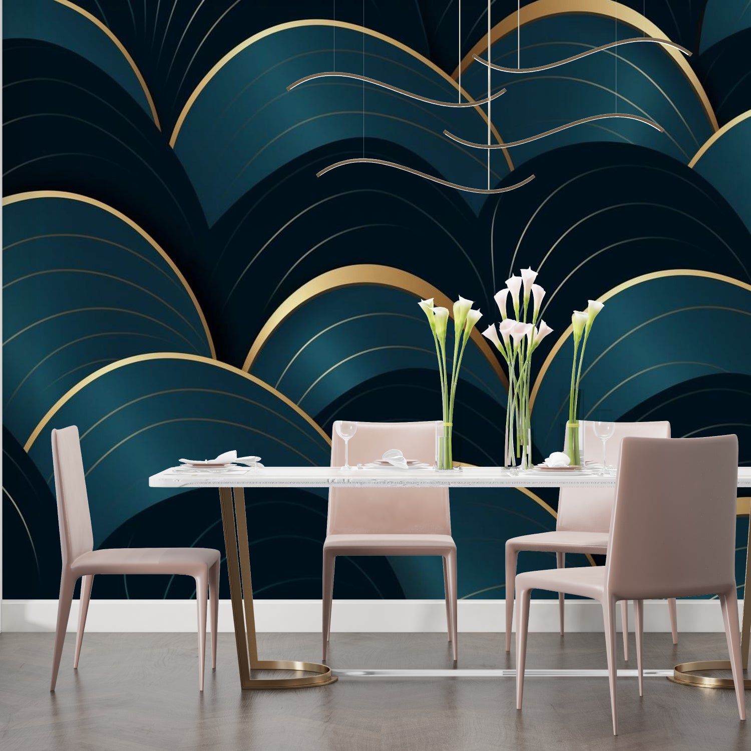 Art Deco Tapet | Djup Teal med Guld Bågar