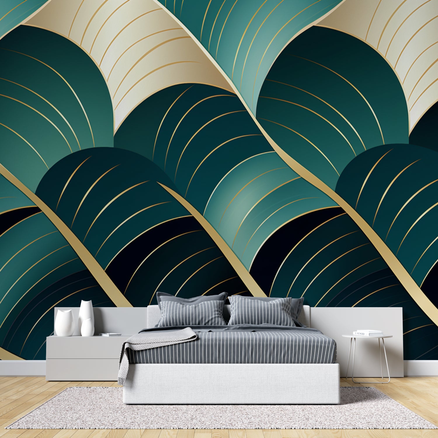 Art Deco Tapet | Smaragdgrön och Guld Geometriska Löv