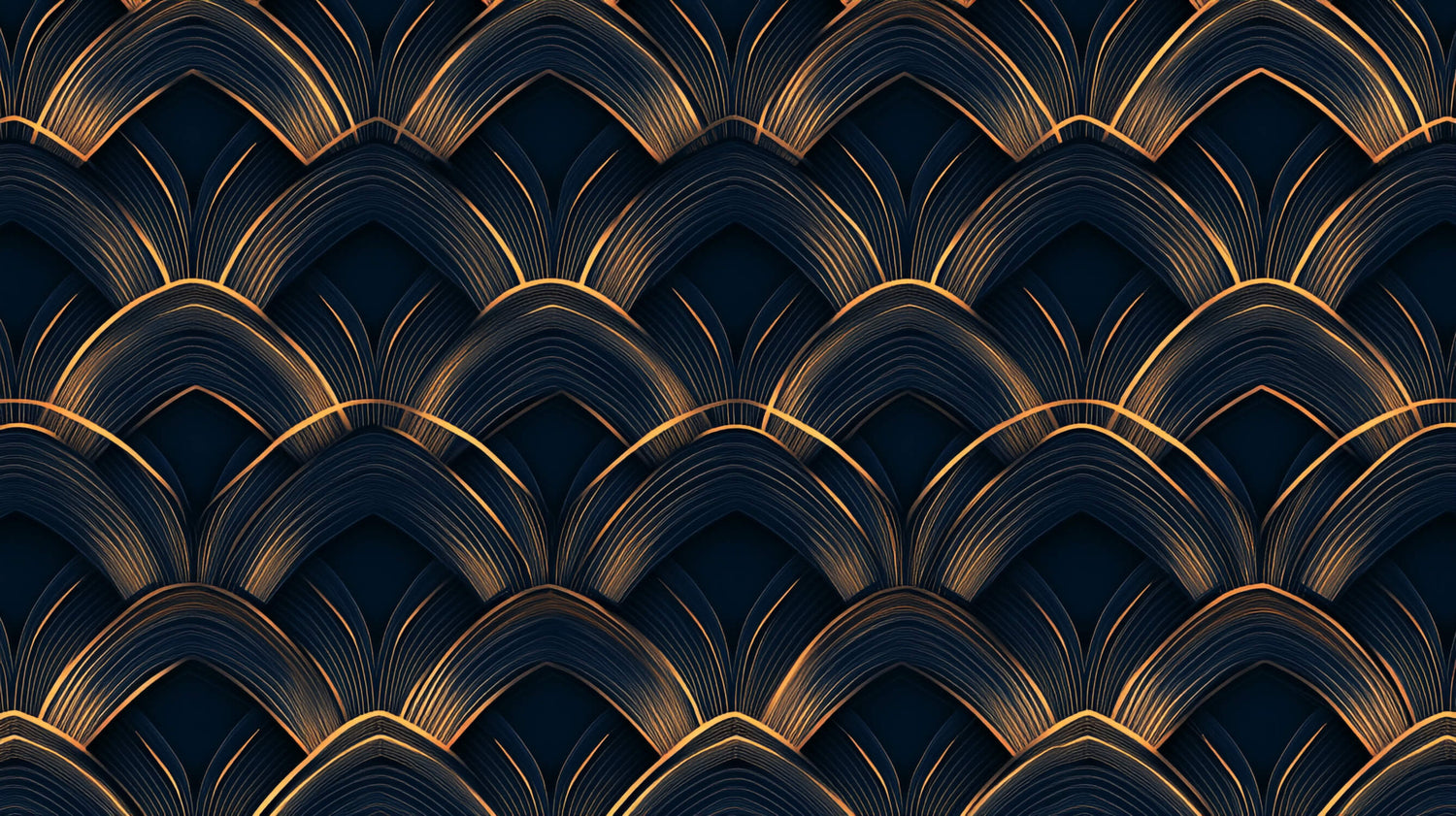 Denna art deco tapet visar ett överdådigt geometriskt solfjädermönster som förkroppsligar tjugotalets glamour. Den djupa marinblå-svarta bakgrunden ger en rik duk för de intrikata gyllene bågarna, vilket skapar en sofistikerad geometrisk tapet design som fångar ljus och uppmärksamhet. Varje kurva och linje är noggrant återgiven för att uppnå en fantastisk tredimensionell effekt, vilket gör att mönstret ser ut att flöda över väggen med graciös rörelse.