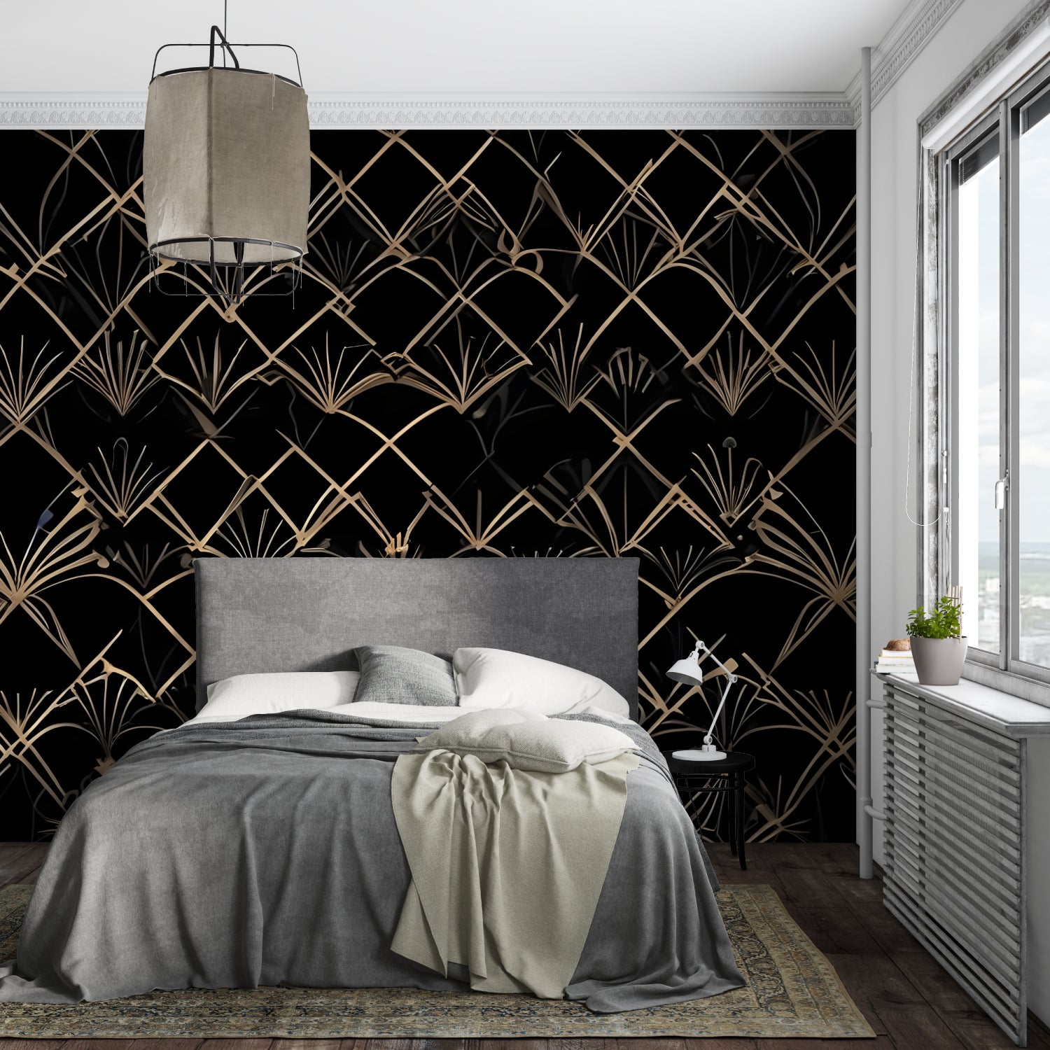 Denna art deco tapet visar ett utsökt geometriskt mönster där guldfärgade linjer dansar över en djup svart bakgrund. De sofistikerade fläktliknande motiven skapar en fängslande gitterdesign som förkroppsligar den lyxiga essensen av art deco stil tapet. Varje intrikat detalj utgör en del av ett upprepat mönster som fångar den glamorösa andan från tjugotalets glansdagar, samtidigt som den behåller en samtida kant.