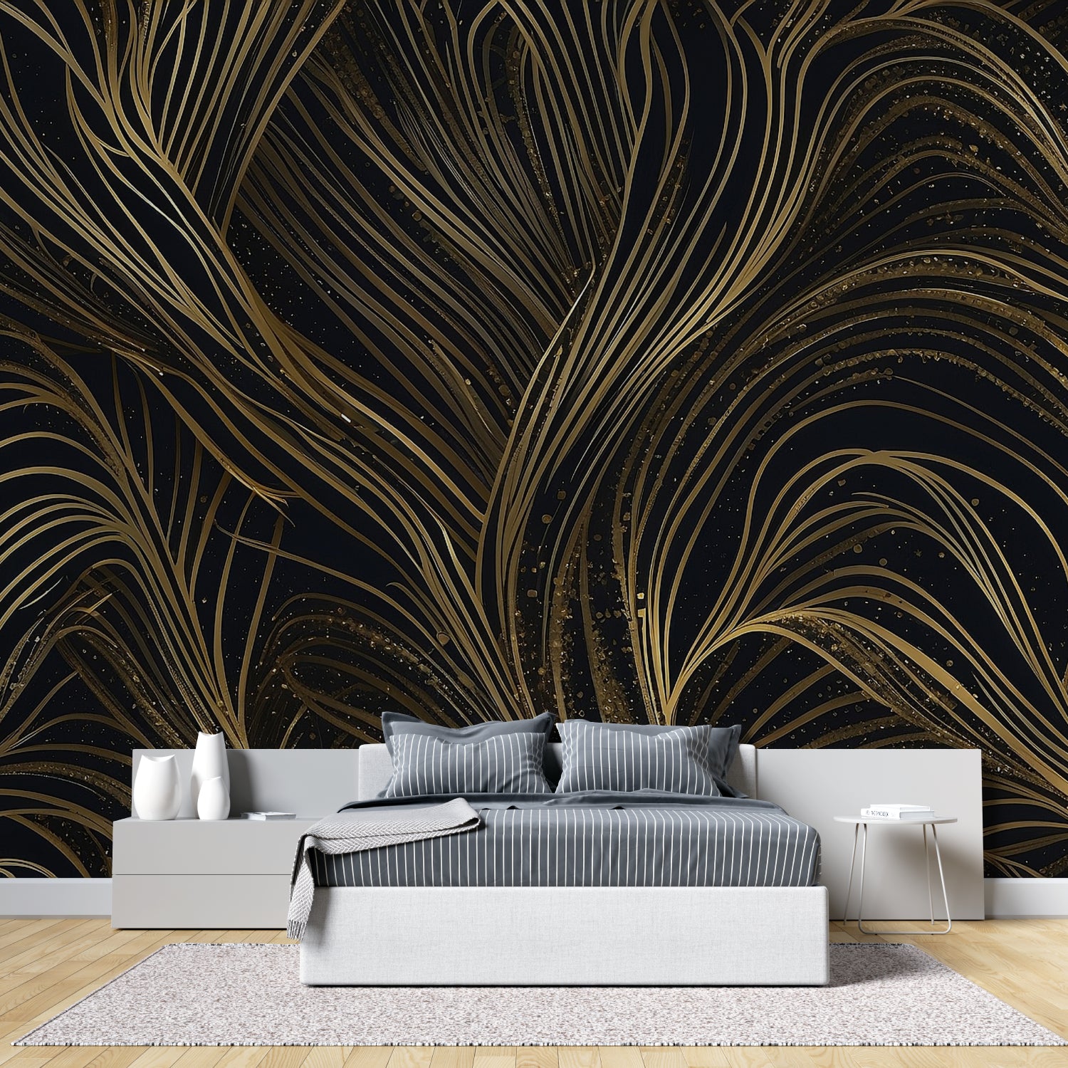 Denna art deco tapet visar en förtrollande dans av gyllene böjda linjer mot en rik svart bakgrund. De svepande metalliska kurvorna skapar ett fascinerande mönster, förstärkt av fina guldfärgade prickar som tillför djup och glans. Den svart och guld muralen kombinerar dramatisk kontrast med flytande rörelse och erbjuder en sofistikerad tolkning av klassisk art deco-estetik med en modern twist.