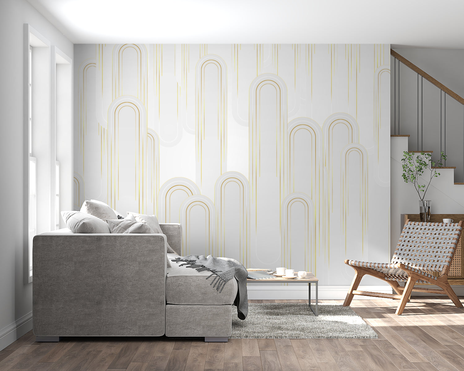 Denna art deco tapet visar en elegant sammansättning av gyllene bågar mot en ren vit bakgrund, vilket skapar ett sofistikerat geometriskt mönster som fångar essensen av modern lyx. De delikata metalliska linjerna bildar graciösa arkitektoniska kurvor som dansar över väggen, medan den minimalistiska vita och gyllene tapeten behåller en luftig, rymlig känsla som tillför förfinad elegans till varje interiör.
