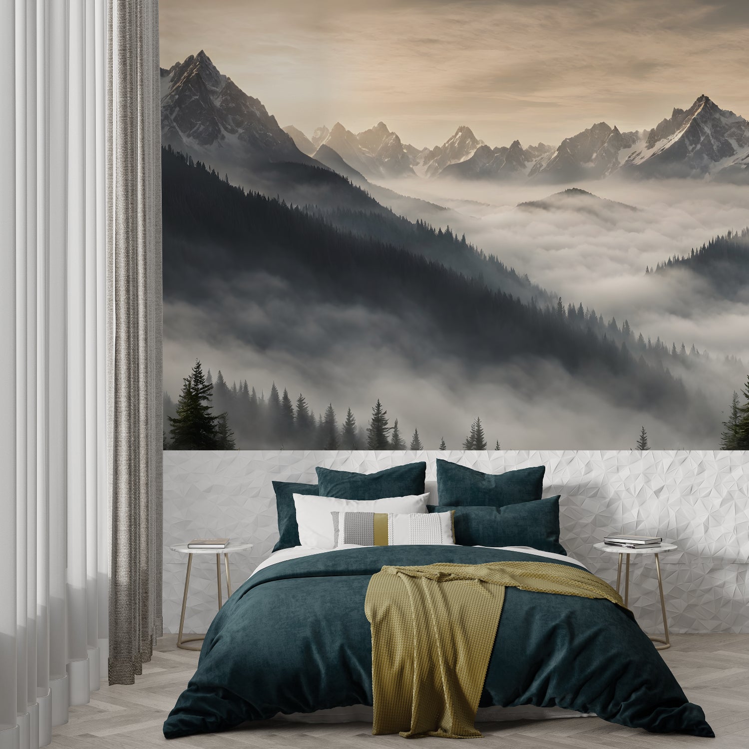 The soft fog effect creates a magical morning feel in your mountain landscape mural.