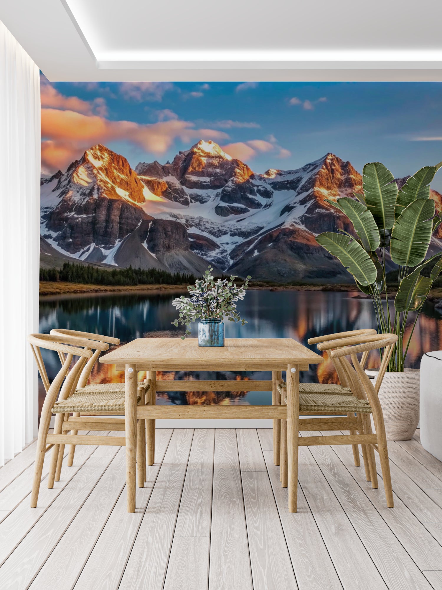 Denna fjällandskaps tapet fångar naturens mest magnifika ögonblick när solljuset badar snötäckta toppar i varma gyllene nyanser. Den dramatiska panoraman visar majestätiska berg som speglas i en kristallklar alpsjö, där ljusets samspel skapar en fängslande uppvisning av orangefärgade moln mot en djupblå himmel. Den panoramiska fjällmålningen kombinerar robusta klippväggar med orörda snöfält och skapar en övertygande komposition av textur och naturlig storslagenhet.