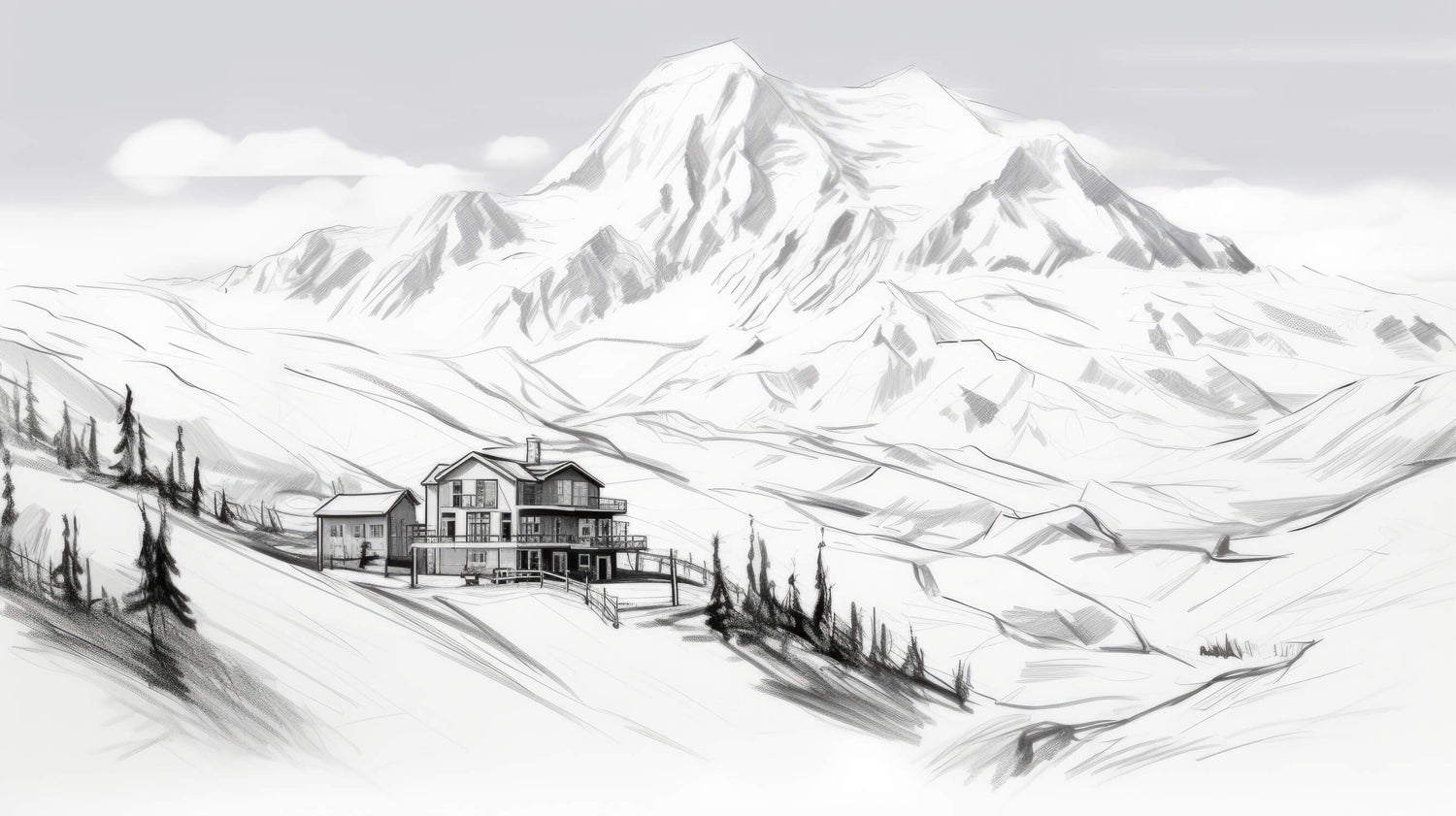 Bergstapet | Svartvit alpin chalet-skiss