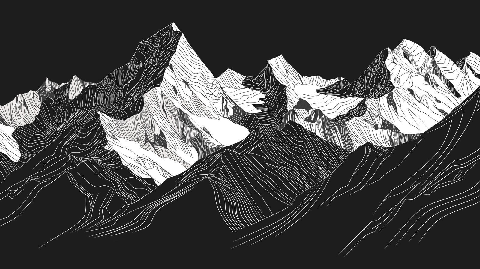 Denna tapet med bergskedja visar en mästerlig blandning av konstnärlig precision och naturlig storslagenhet. Det intrikata linjearbetet skapar en dramatisk topografisk avbildning av majestätiska toppar mot en djup svart bakgrund, där varje geometrisk bergsdesign reser sig med djärva vita konturer och flödande åsar. Det sofistikerade samspelet mellan positivt och negativt utrymme ger ett slående visuellt djup som fångar uppmärksamhet samtidigt som det behåller konstnärlig återhållsamhet.