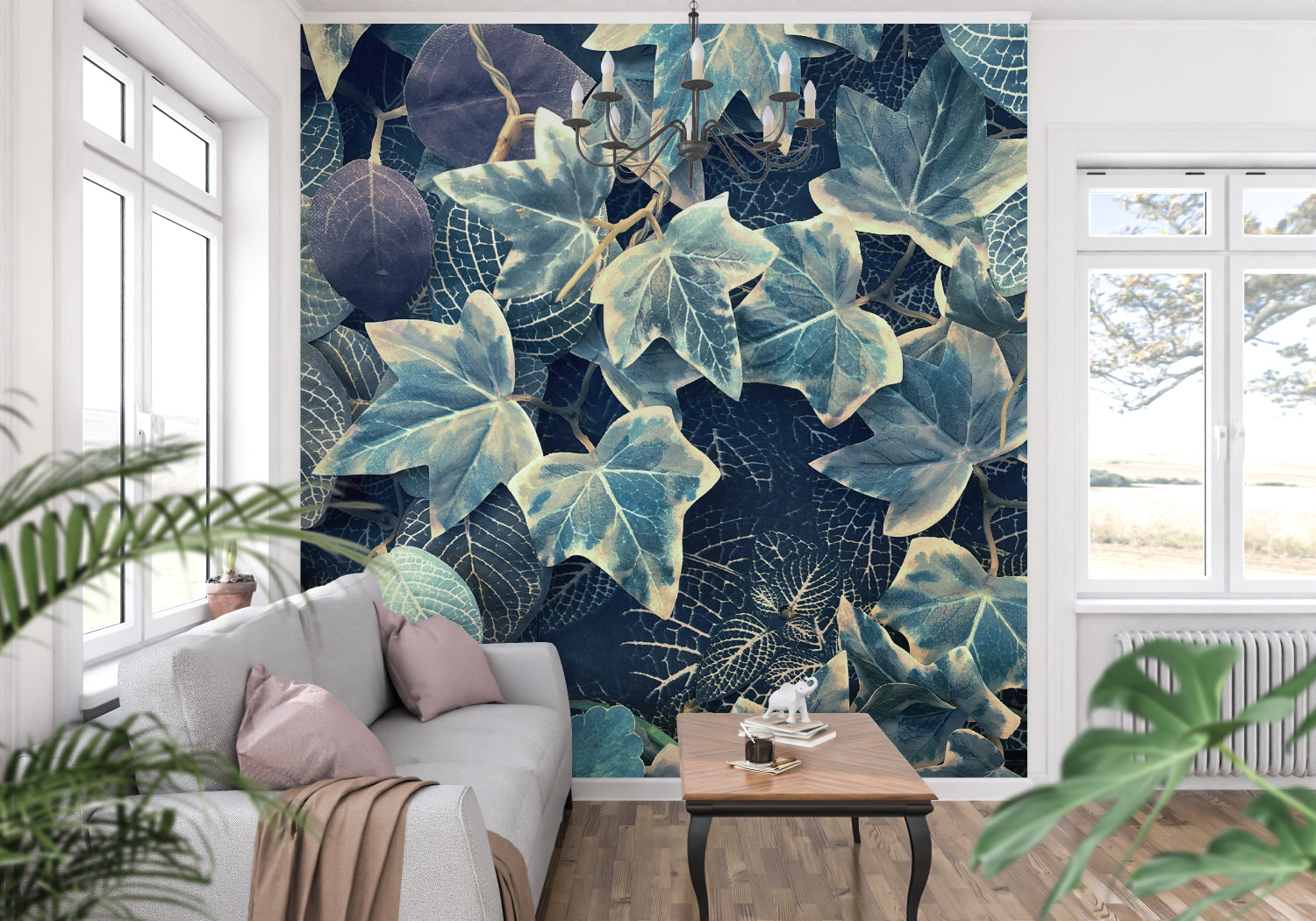 Denna botaniska bladväggtapet visar en förtrollande komposition av blågrönt lövverk mot en djup marinblå bakgrund. Fina bladnerver skapar intrikata mönster genom hela designen, medan lönnformade blad överlappar i en sofistikerad arrangemang. Den naturinspirerade tapeten kombinerar svala tealtoner med mjuka salviatoner, vilket skapar ett fascinerande djup som fångar essensen av en mystisk trädgård.