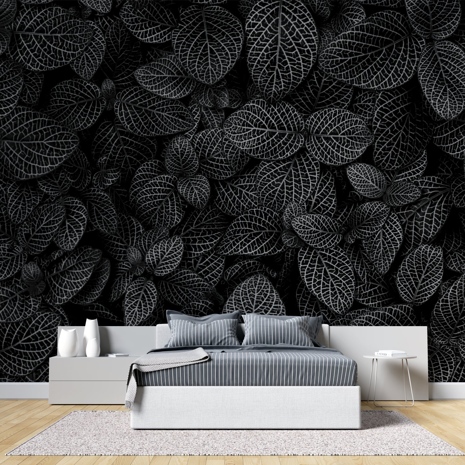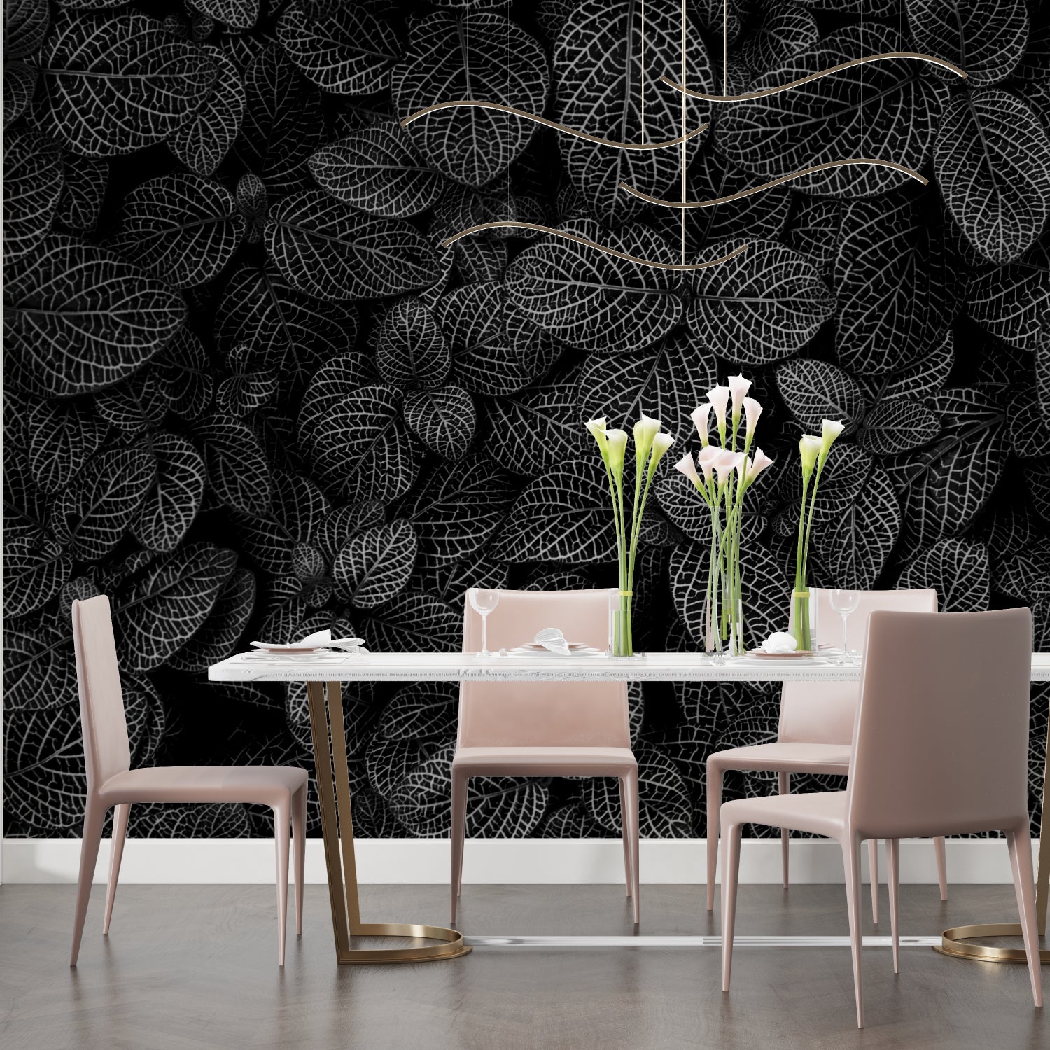 Denna svarta bladtapet visar ett intrikat botaniskt mönster där känsliga bladnerver skapar en fascinerande monokromatisk display. Varje blad är noggrant detaljerat mot den djupa svarta bakgrunden, vilket bildar en sofistikerad naturinspirerad tapet som kombinerar organisk skönhet med modern elegans. Den dramatiska kontrasten mellan de silvriga bladkonturerna och den rika mörka bakgrunden skapar ett förtrollande djup som drar blicken.