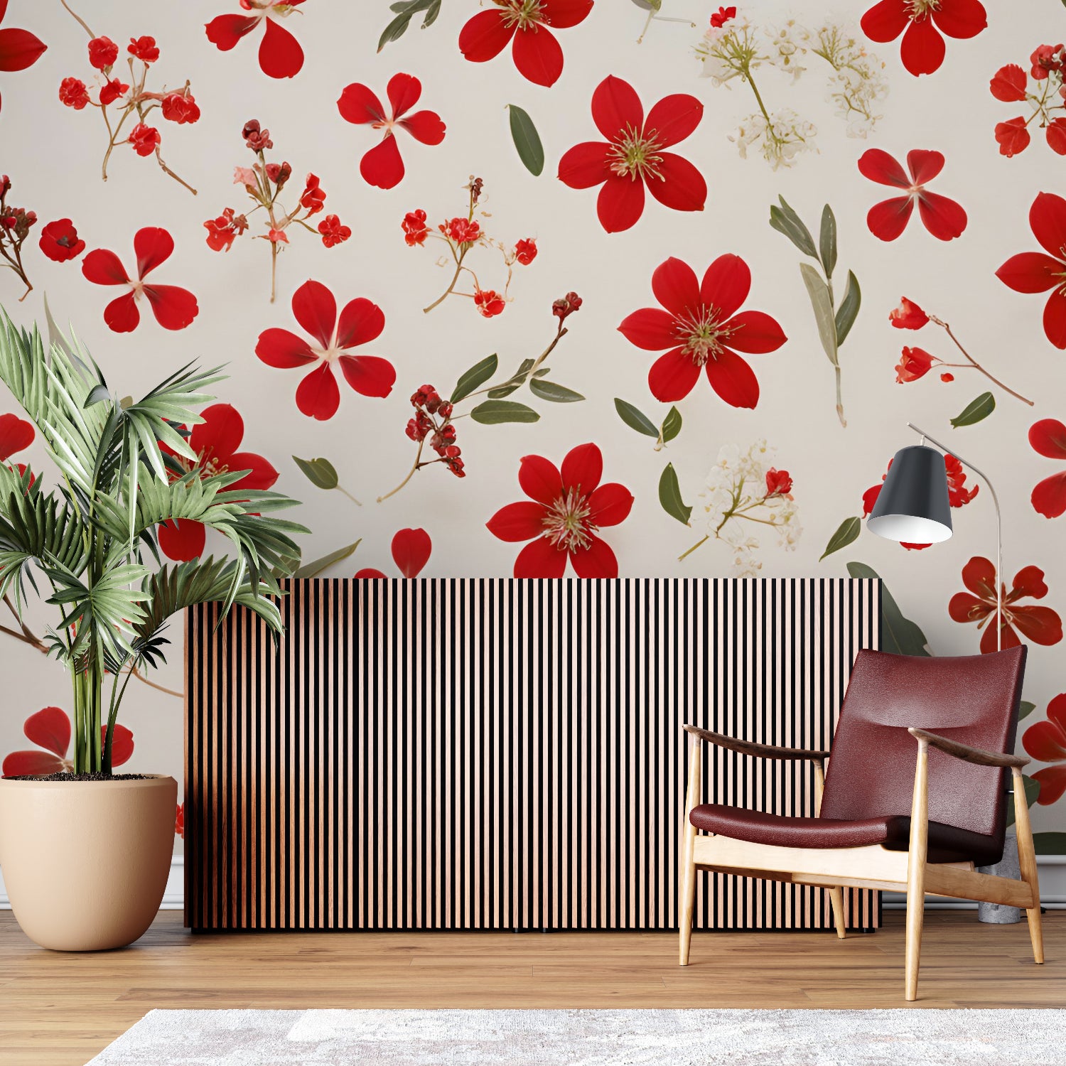 Denna blommiga tapetväggmålning visar en förtrollande samling av livfulla röda blommor som elegant sprids över en mjuk beige bakgrund. Varje blomma är noggrant avbildad med delikata kronblad och gyllene centrum, kompletterade med olivgröna blad som tillför naturligt djup till designen. Den röda blommiga tapeten skapar ett sofistikerat mönster som kombinerar djärva botaniska element med luftig placering, vilket låter varje blomma göra sitt individuella intryck.