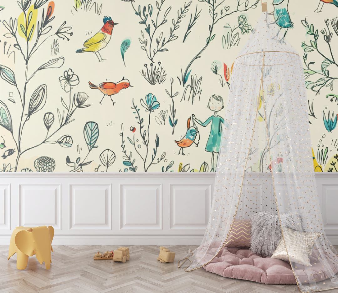 Denna förtrollande barnfågel tapet skapar en sagolik trädgårdsscen med delikata handritade illustrationer. Glada sångfåglar i livfulla gula och korallfärgade nyanser dansar bland mjuka turkosa blommor och graciösa botaniska skisser, allt mot en lugnande krämfärgad bakgrund. Den barnrumsfågel tapeten har charmiga linjekonstdetaljer som ger den lekfulla trädgårdsscenen liv med sin blandning av naturinspirerade element.