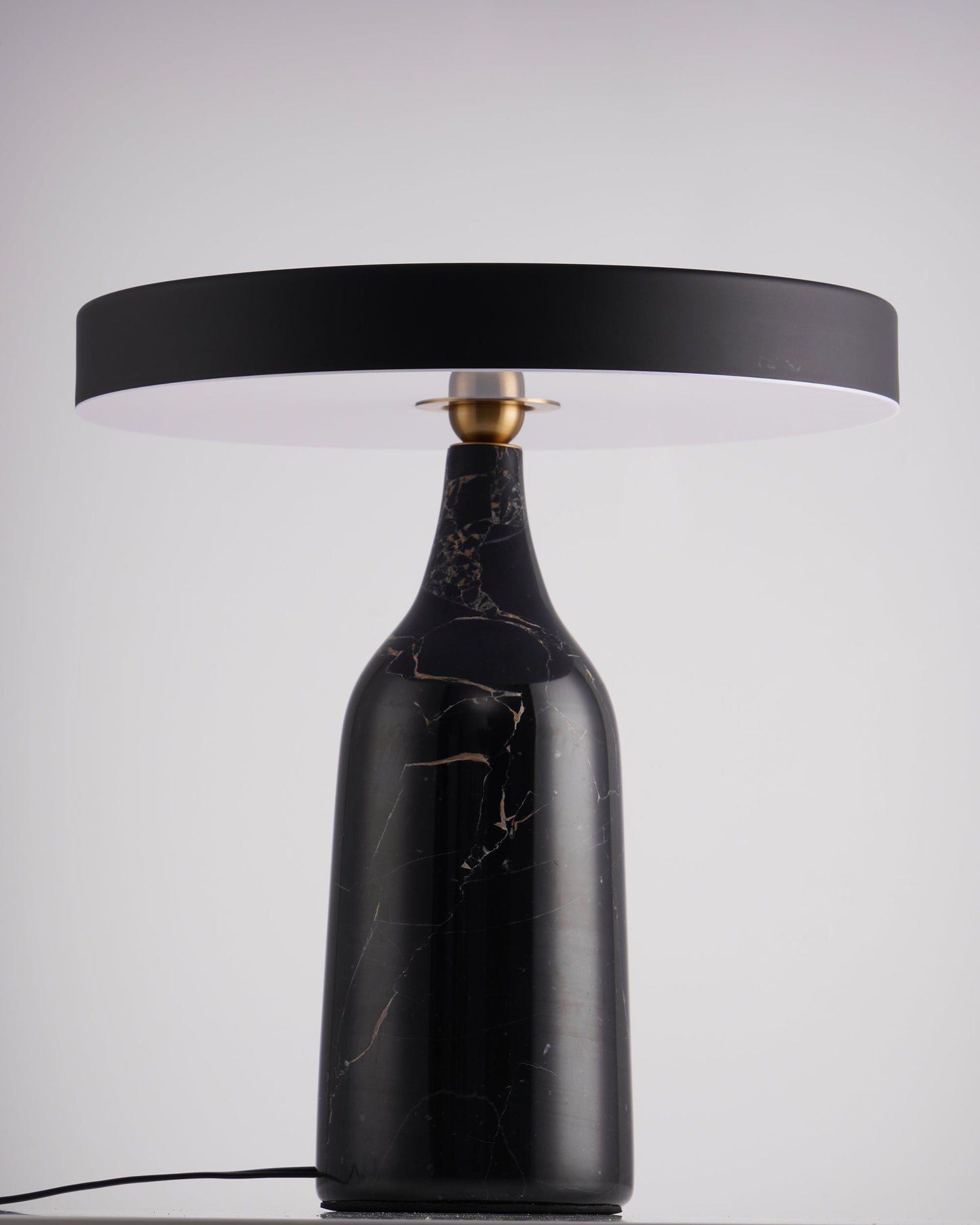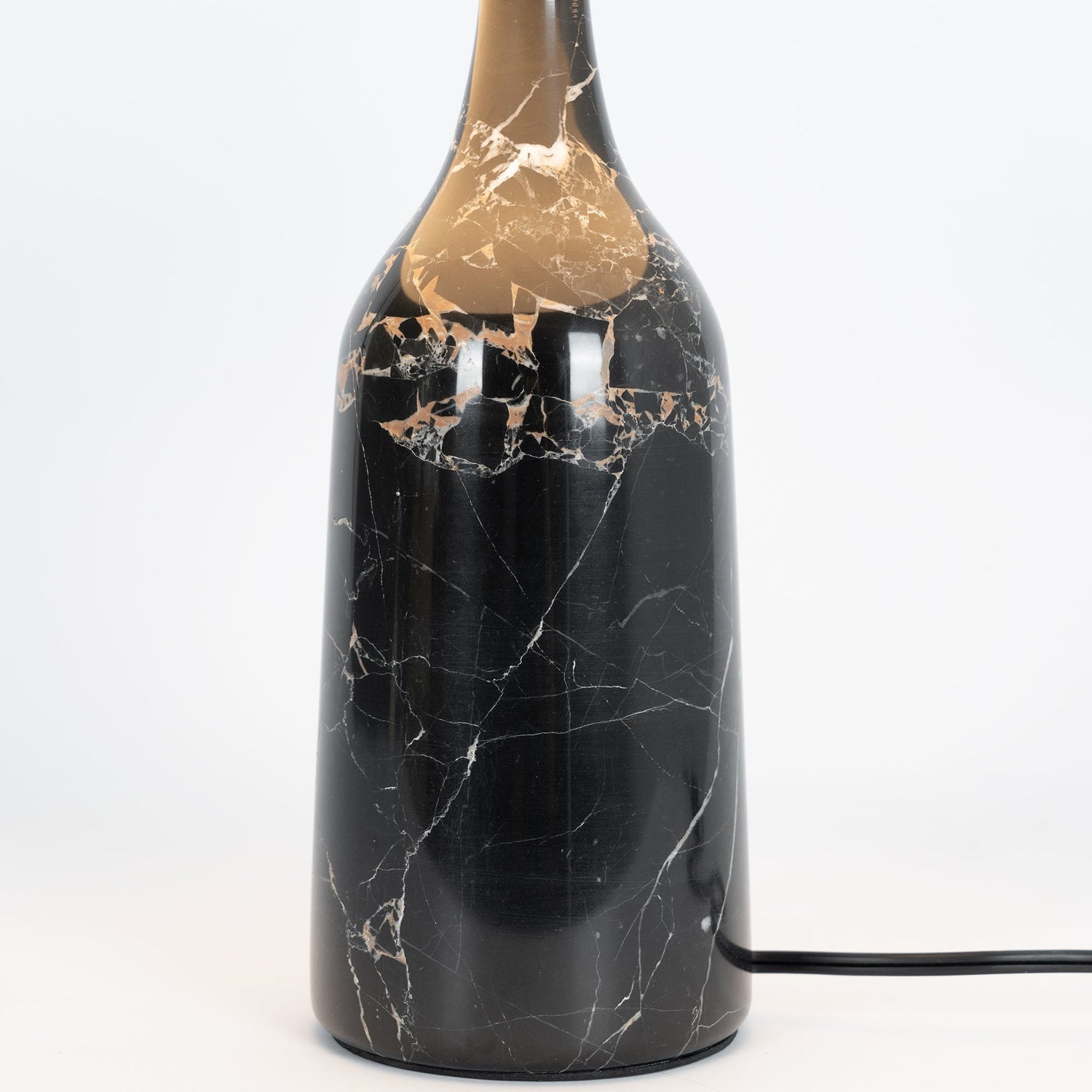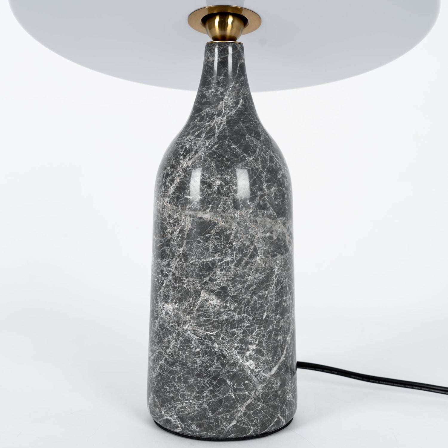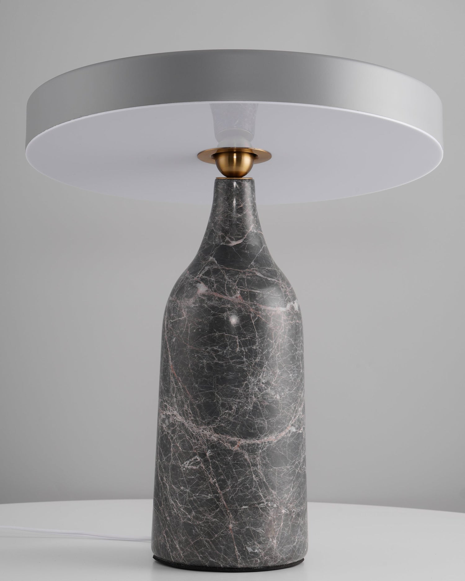 Denna moderna bordslampa kombinerar en slank metallskärm med en handdrejad marmorfot, vilket skapar ett förfinat utseende. Den innovativa designen har en roterande punkt där lampskärmen kan lutas för att rikta ljusstrålen som önskat. Denna lampa tillför en lyxig och elegant atmosfär till varje rum.