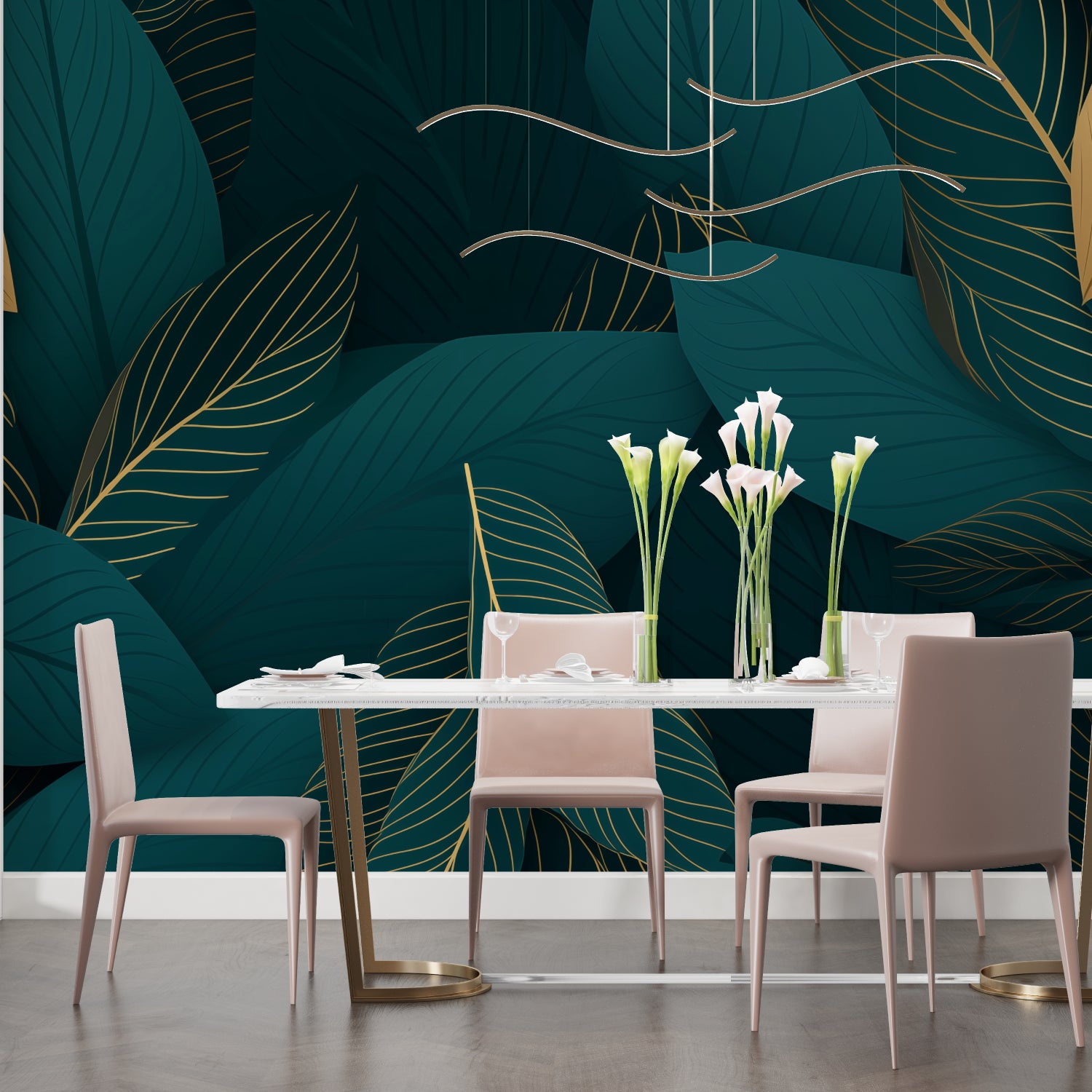 Denna tropiska bladmönstrade tapet visar en sofistikerad sammansättning av överdimensionerade smaragdgröna löv prydda med eleganta gulddetaljer. De djupa skogsgröna bladen skapar en djärv, tredimensionell effekt mot den mörka bakgrunden, medan fina gyllene vener löper genom varje blad och tillför en touch av lyxig förfining. Den botaniska väggmålningen kombinerar naturinspirerade element med samtida konstnärlig flair och skapar en slående visuell effekt.