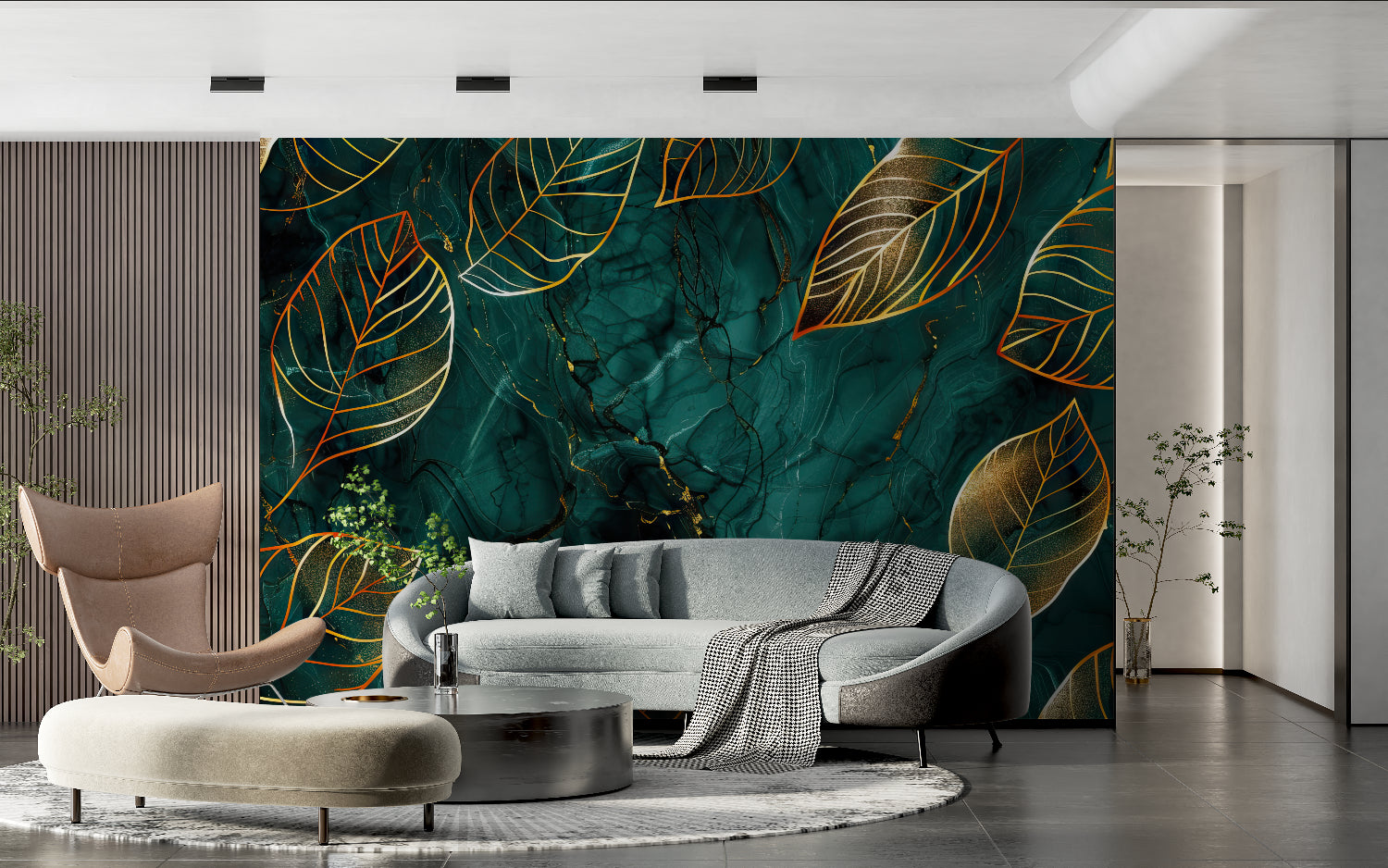 Denna lyxiga bladtapet visar en förtrollande komposition av blad med guldkonturer mot en rik smaragdgrön marmorbakgrund. Det sofistikerade samspelet mellan metalliskt guld och kopparådring skapar djup och rörelse, medan designen av tropisk lövverkstapet ger en känsla av förfinad elegans. Den marmorerade texturen under lägger till ett lager av samtida lyx och skapar en fängslande bakgrund som kräver uppmärksamhet.