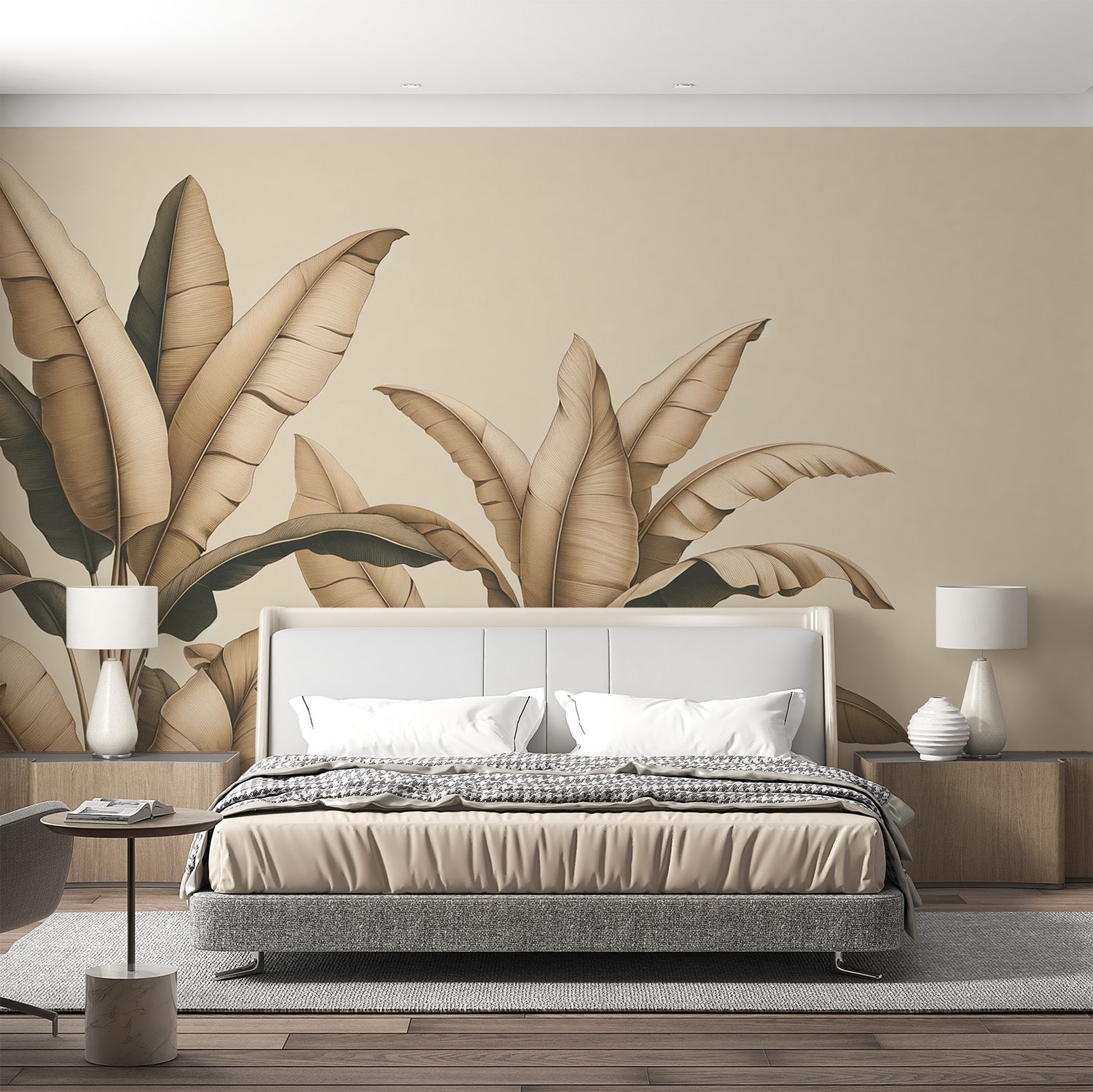 Denna tropiska bladtapet visar majestätiska bananblad i sofistikerade beige toner mot en varm neutral bakgrund. Det överdimensionerade botaniska motivet har skickligt detaljerad lövverk med naturliga texturer och subtil skuggning som skapar anmärkningsvärd djup. Varje bananbladstapet-element är konstnärligt utformat för att fånga den stora skalan och de graciösa kurvorna hos tropisk växtlighet.