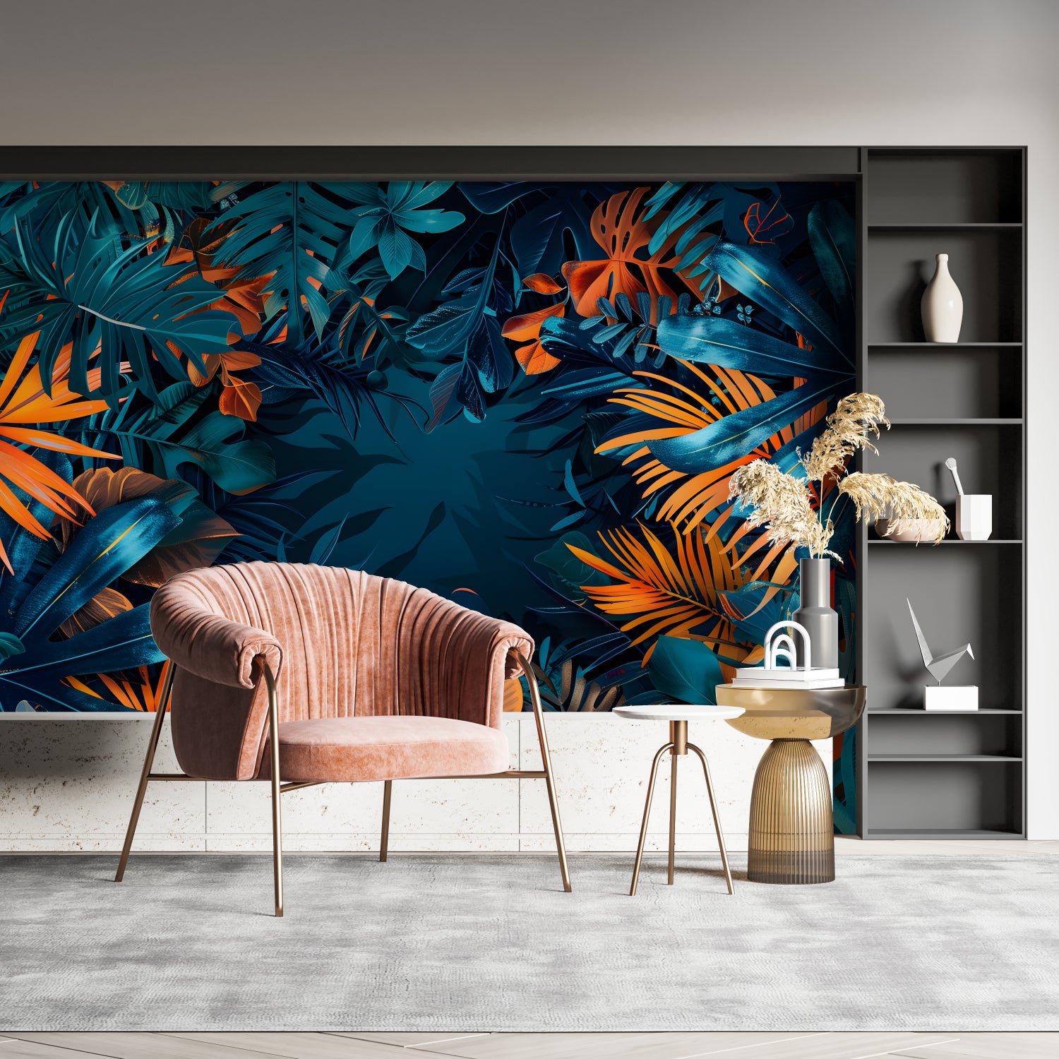 The mix of blue and orange creates a fresh, modern look in your botanical paradise wallpaper.