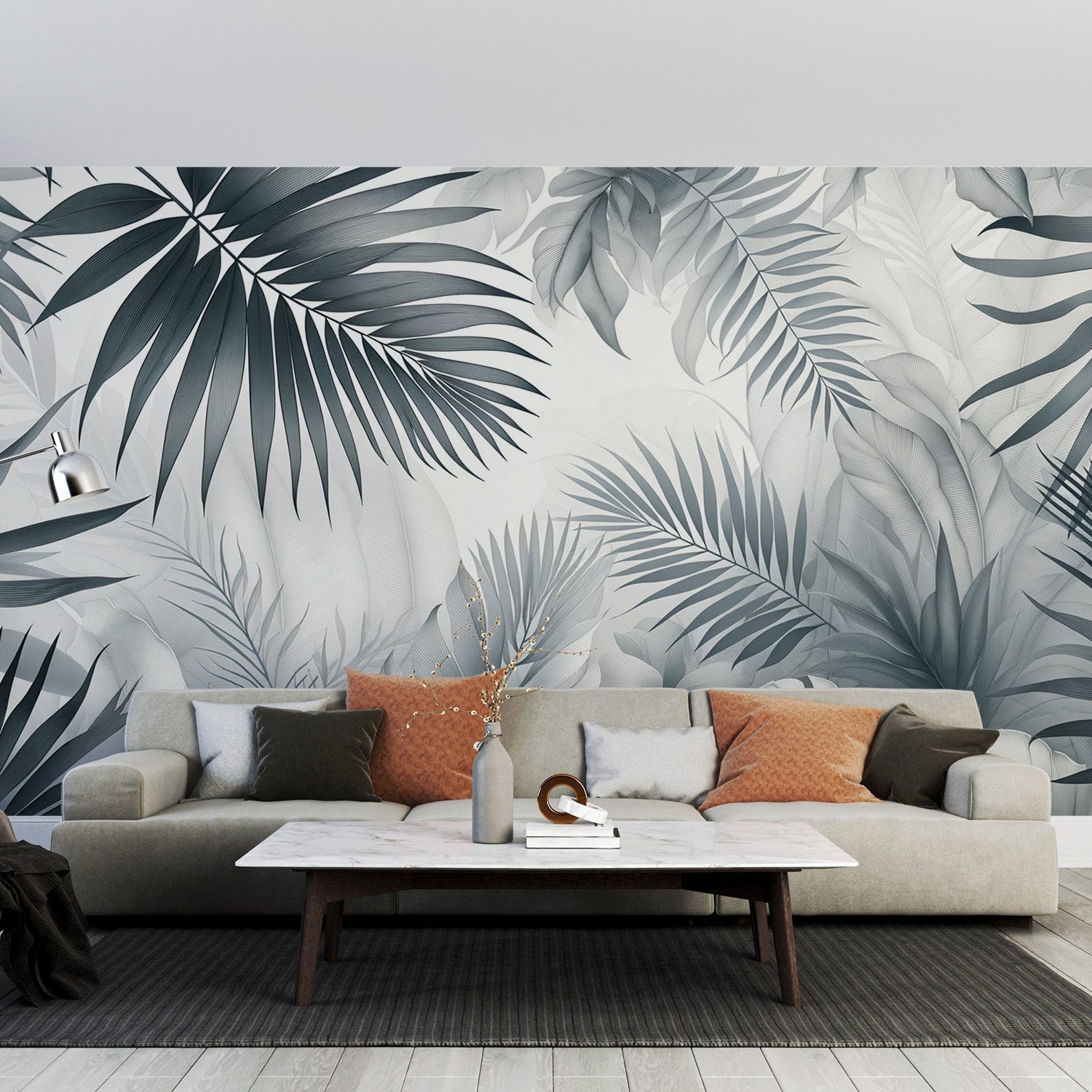 Denna tropiska lövverkstapet visar en sofistikerad sammansättning av palmblad och monstera blad i slående nyanser av grått mot en ren vit bakgrund. Det storskaliga botaniska mönstret har noggrant detaljerade palmblad som sveper över väggen med dramatisk effekt, medan delikata monstera blad tapet element skapar djup och visuellt intresse genom deras lager-på-lager komposition.