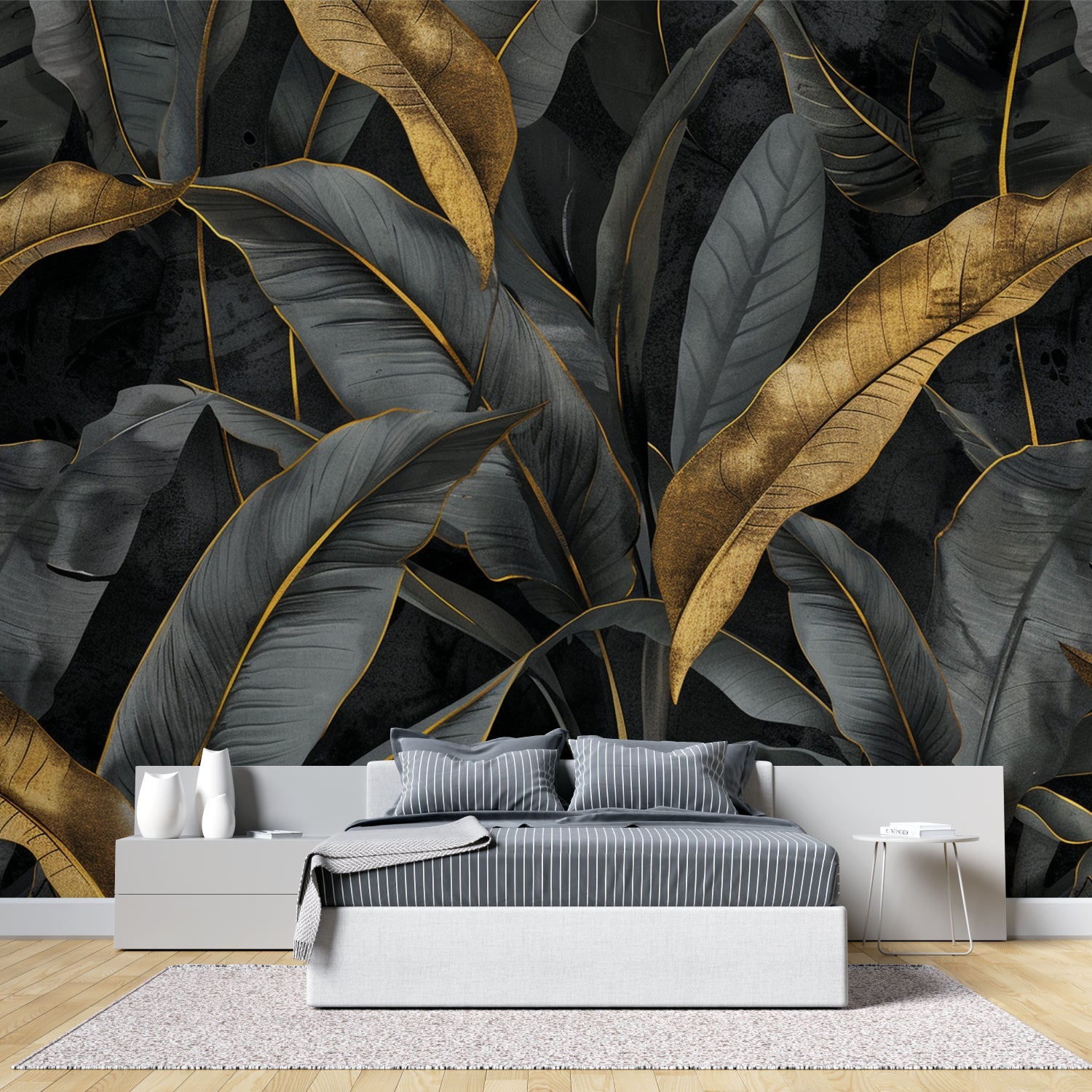 Denna tropiska bladtapet visar ett dramatiskt samspel av mörka kolsvarta bananblad prydda med lyxiga gyllene accenter. Det storskaliga botaniska mönstret skapar djup genom lager av gråtonade lövverk, medan metalliska guldfåror och utvalda gyllene blad tillför sofistikerad lyster. Varje bananbladstapet-element är återgivet med exceptionell detaljrikedom, vilket skapar en dyster men ändå överdådig atmosfär mot den djupa svarta bakgrunden.