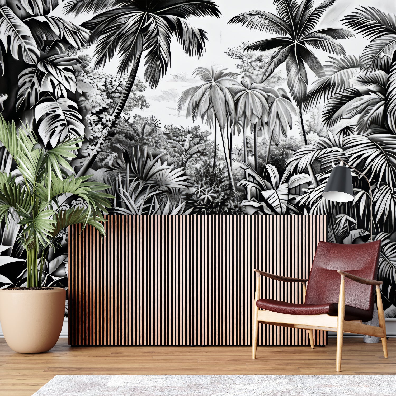 Denna tropiska djungeltapet presenterar ett slående monokromt mästerverk där palmblad och monstera blad skapar ett dramatiskt skärpedjup. De intrikata detaljerna i den svartvita tropiska tapeten visar ett tätt tak av exotisk lövverk, från höga palmer till frodig undervegetation, alla återgivna i skarpa kontraster som ger kompositionen liv med sofistikerad konstnärlighet.